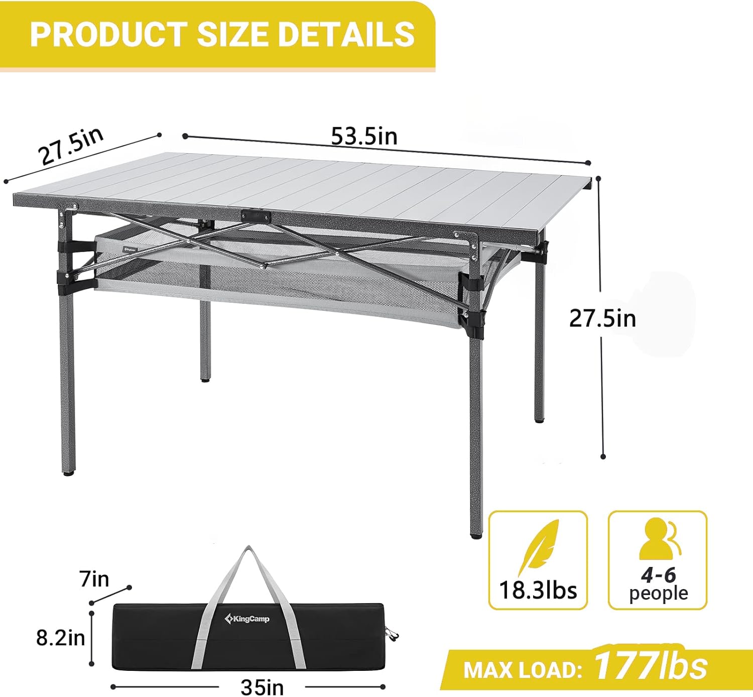 - 【Large Folding Camping Table with Storage】The kingcamp aluminum large desktop area (53.5 × 27.5 inches) provides comfortable space for 4-6 people, with a triangle stent design for added leg room at 27.5 inches height.