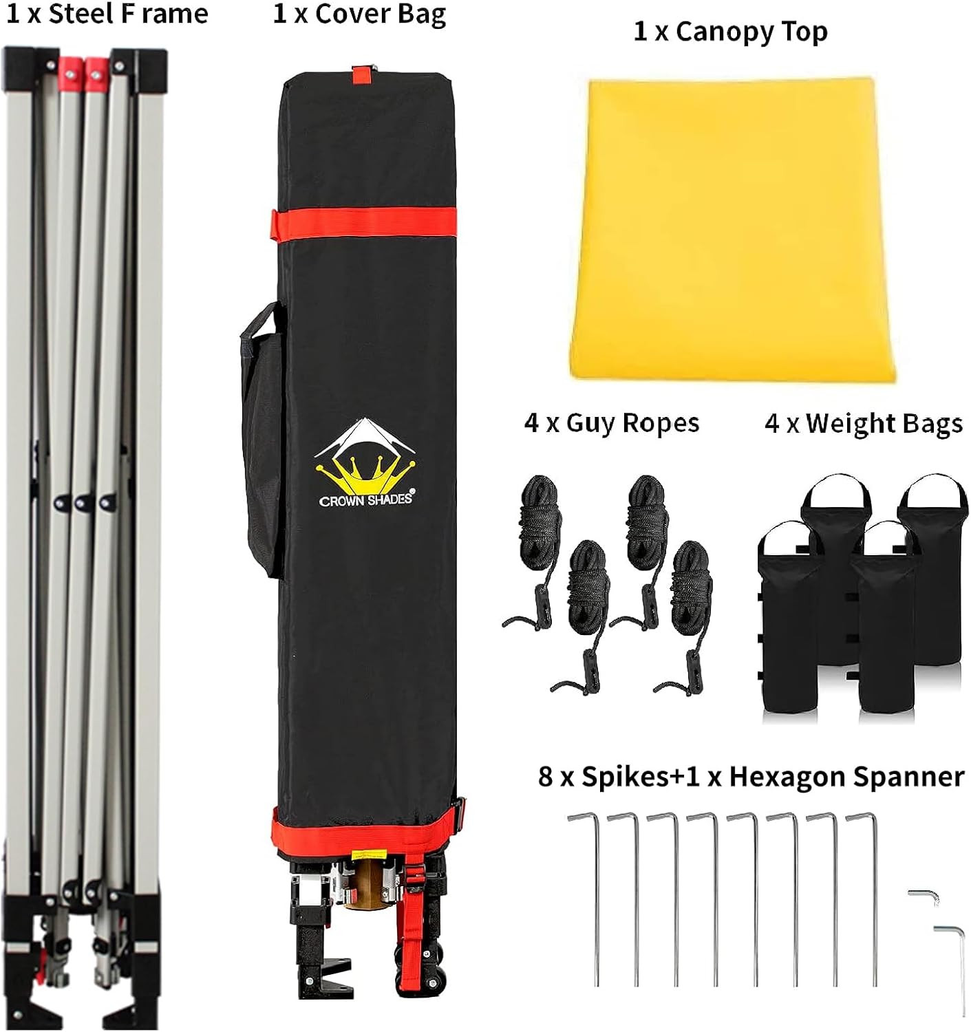 - HIGH GRADE STEEL FRAME - The durable, high-grade, corrosion-resistant steel truss frame with hardened through bolts comes pre-assembled and can be set up without any tools. Engineered to support up to 120 lbs. distributed across the frame, it ensures robust and reliable performance. The extended ceiling assembly and upgraded high peak design make it easier for rainwater to run off, preventing water pooling on the canopy. Perfect for extended outdoor use at markets, festivals, and exhibitions.