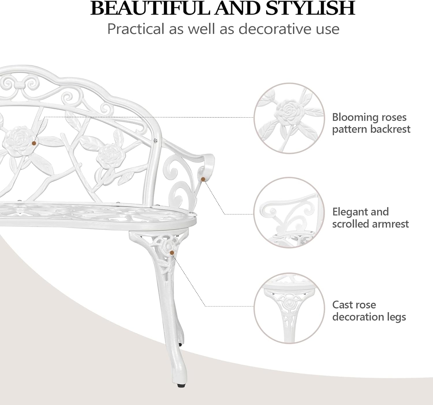 VINGLI 38.5" Patio Park Garden Outdoor Metal Rose Bench,Cast Iron Cast Aluminium Frame Antique Finish Chair,Accented Lawn Front Porch Path Yard Decor Deck Furniture for 2 Person Seat(White