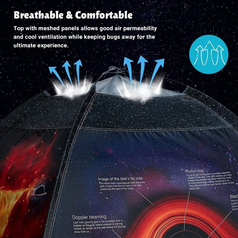 - đ ăATTRACTIVE and UNIQUEă:This kidâs play tent delightfully designed with adorable glowing stars with a black hole explained design that will catch your kidsâ attention. The pop-up tent for kids will ignite fun, creativity and imagination play, space exploration while stimulating physical play.