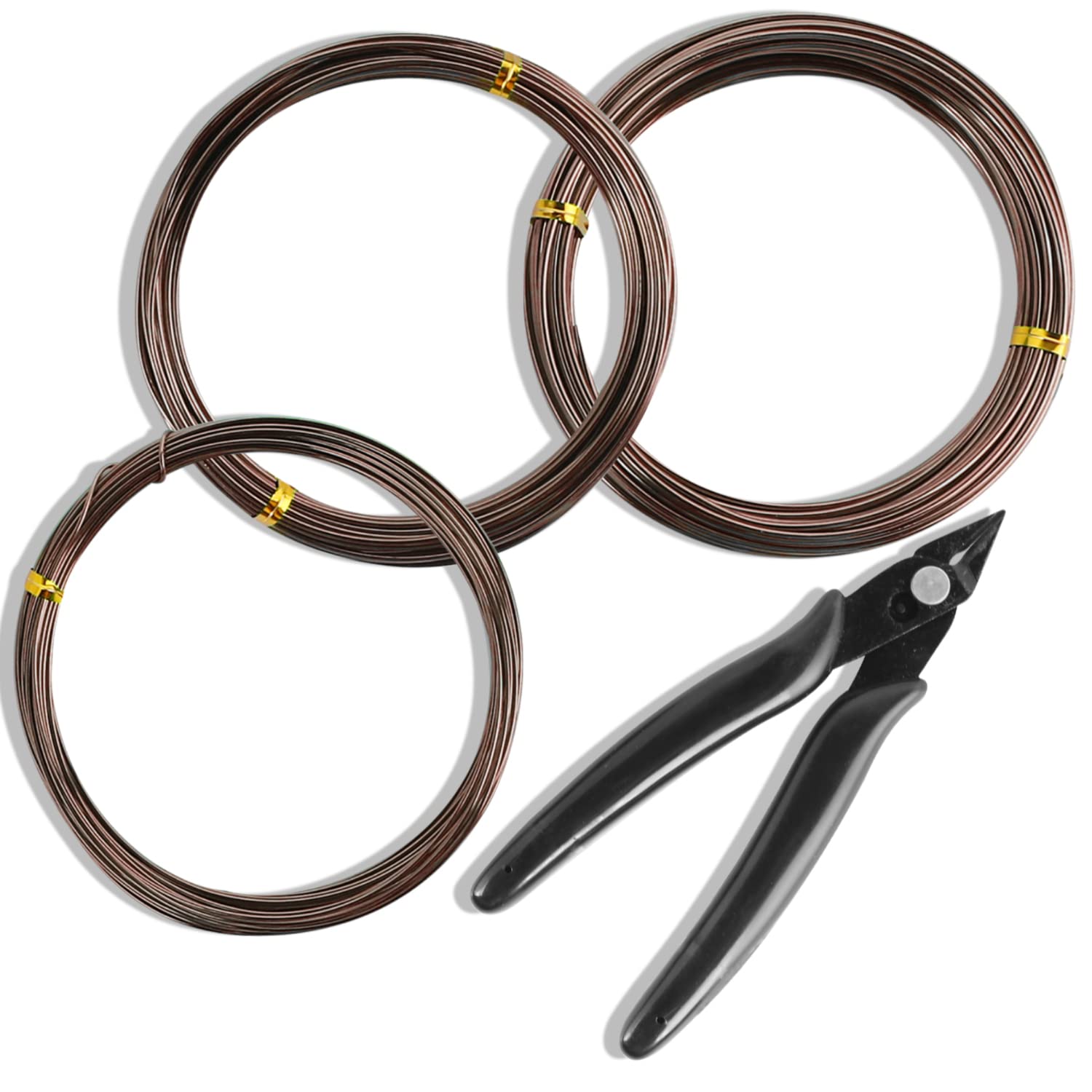Sanlykate Bonsai Wire Tool Kit with Cutter, 3 Roll Tree Training Wires 98 Feet Total, 1.0mm, 1.5mm, 2.0mm Anodized Aluminum Wire Set, Hold Plant Branches Trunks - Brown