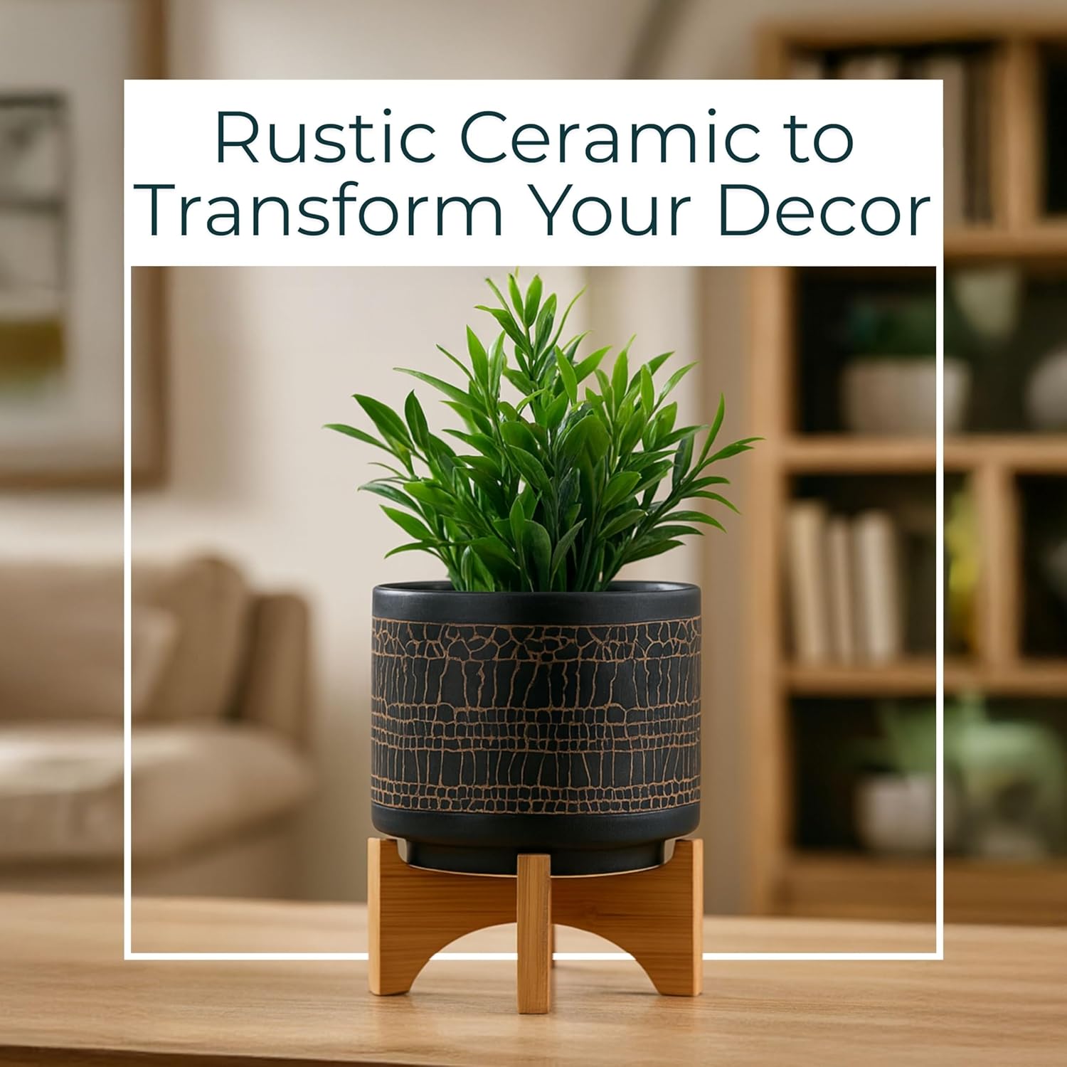 - Elegant Decorative Planter: Featuring a sleek black glaze with a cracked beige texture, these ceramic planter pots with stands measures 8x8x9 inches. Each stoneware indoor planter with stand adds a modern yet timeless accent to any room or garden.