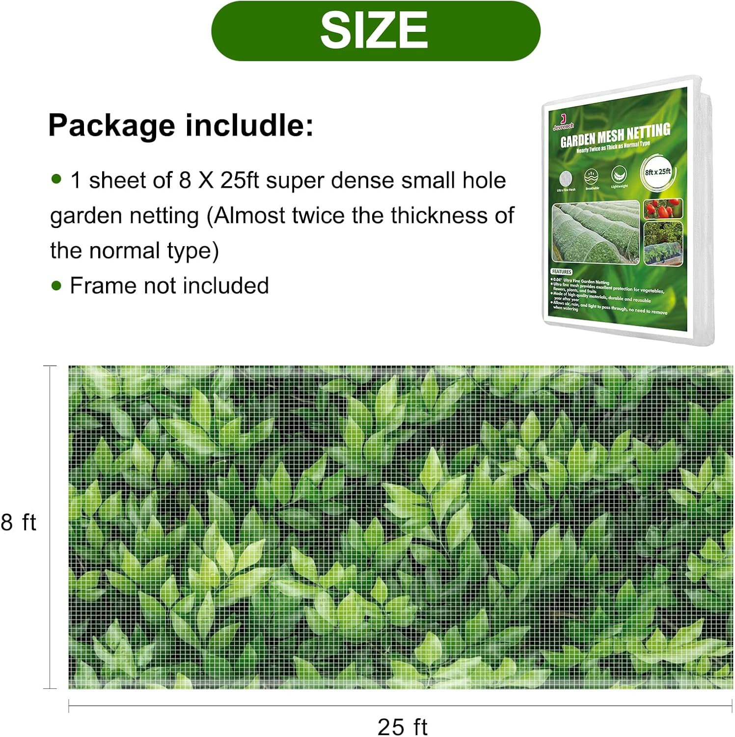 - Effective Physical Barrier: The large size of 8 x 25ft provides more security. Ultra fine garden netting with 0.8 mm x 1 mm ultra fine mesh, garden netting covers are widely used in pastures, orchards, and gardens, protect your vegetable investment with this simple shelter, The plant netting can not only perfectly protect vegetation, but also improve agricultural yields