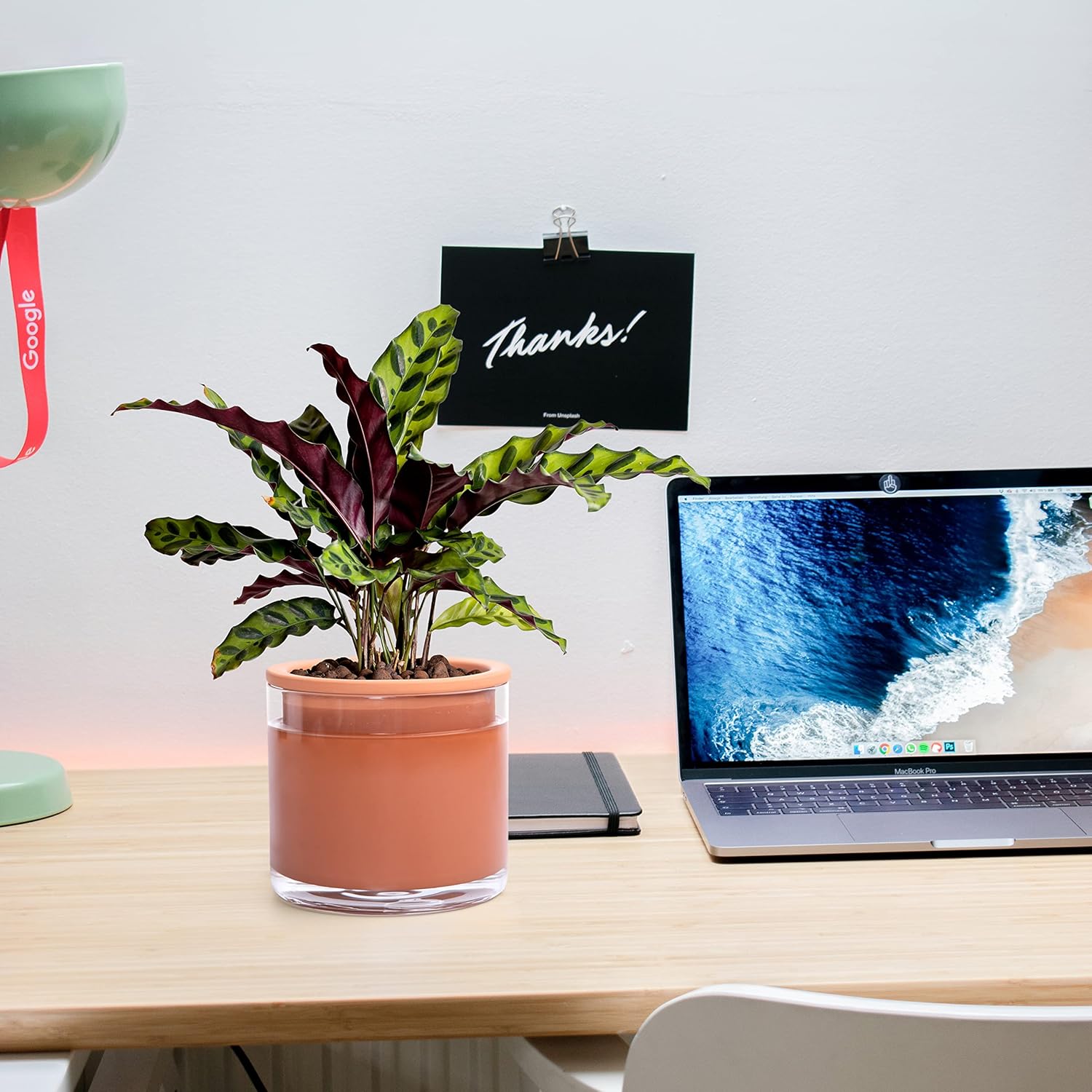 - Terracotta + Glass: Elegant modern design self watering plants pot with ingenious natural breathable terra cotta material and clear glass container. See the water surplus just from a glance.