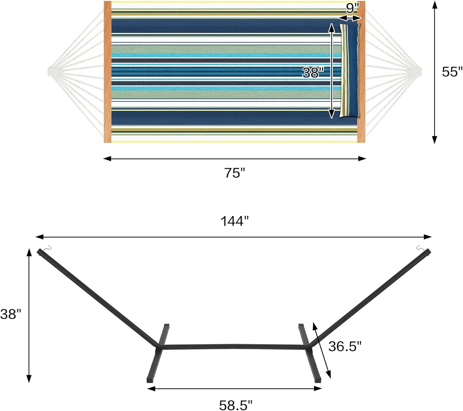 - 【Extra Large Size & Extended Space】With full size 144 inches(L) *55 inches(W) *38 inches(H) this hammock is big enough for two adults. Equipped with added detachable book bag & cup bag this hammock offers more storage space for your leisure time.