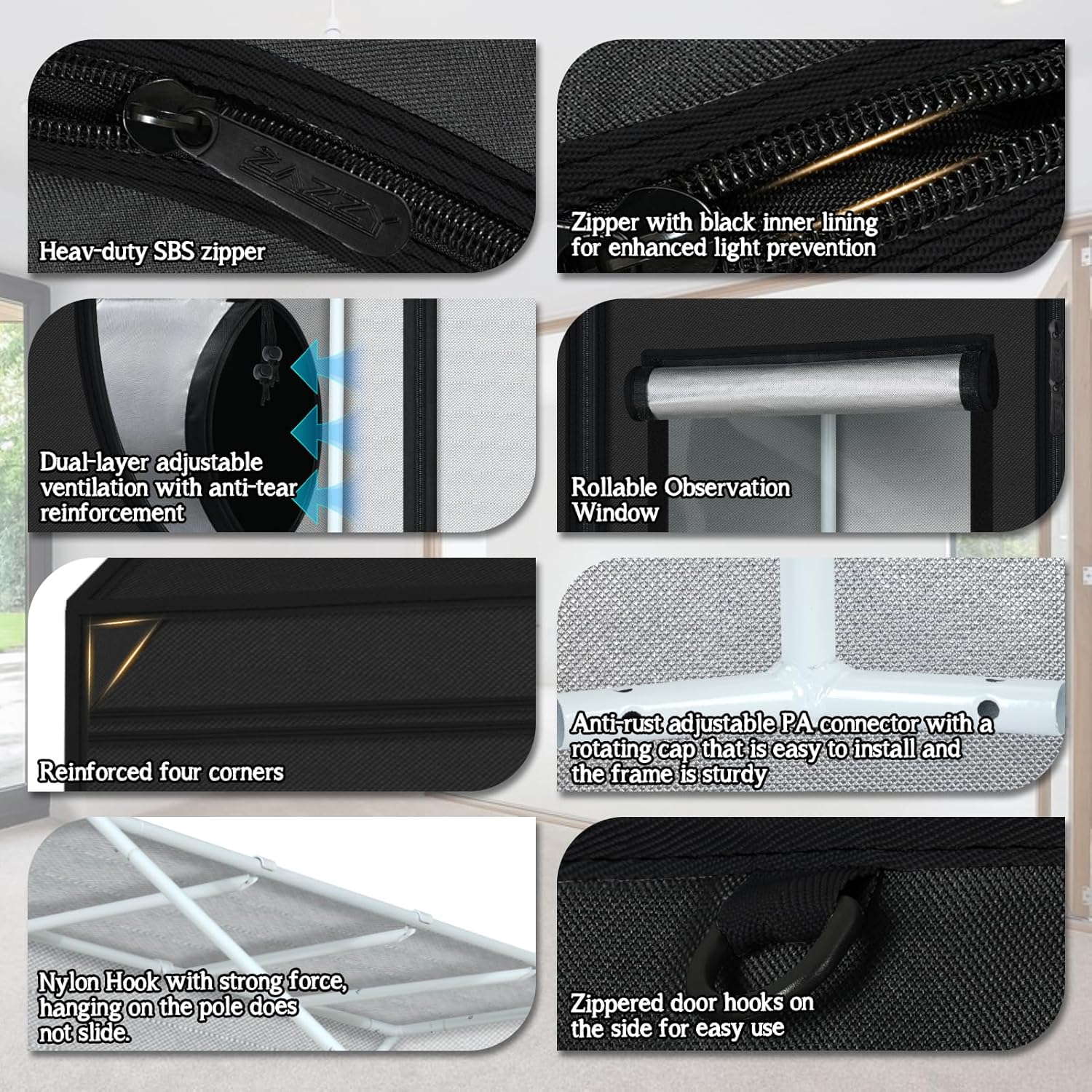 - Top-Quality Materials and Sturdy Frame---Zazzy plant grow tent made of superior quality reflective 600D mylar and double stitched to ensures the light blocking. Heavy duty all steel poles which are rated to handle at least 110 lbs. The frame is specially finished to ensure smooth installation and safe handling.