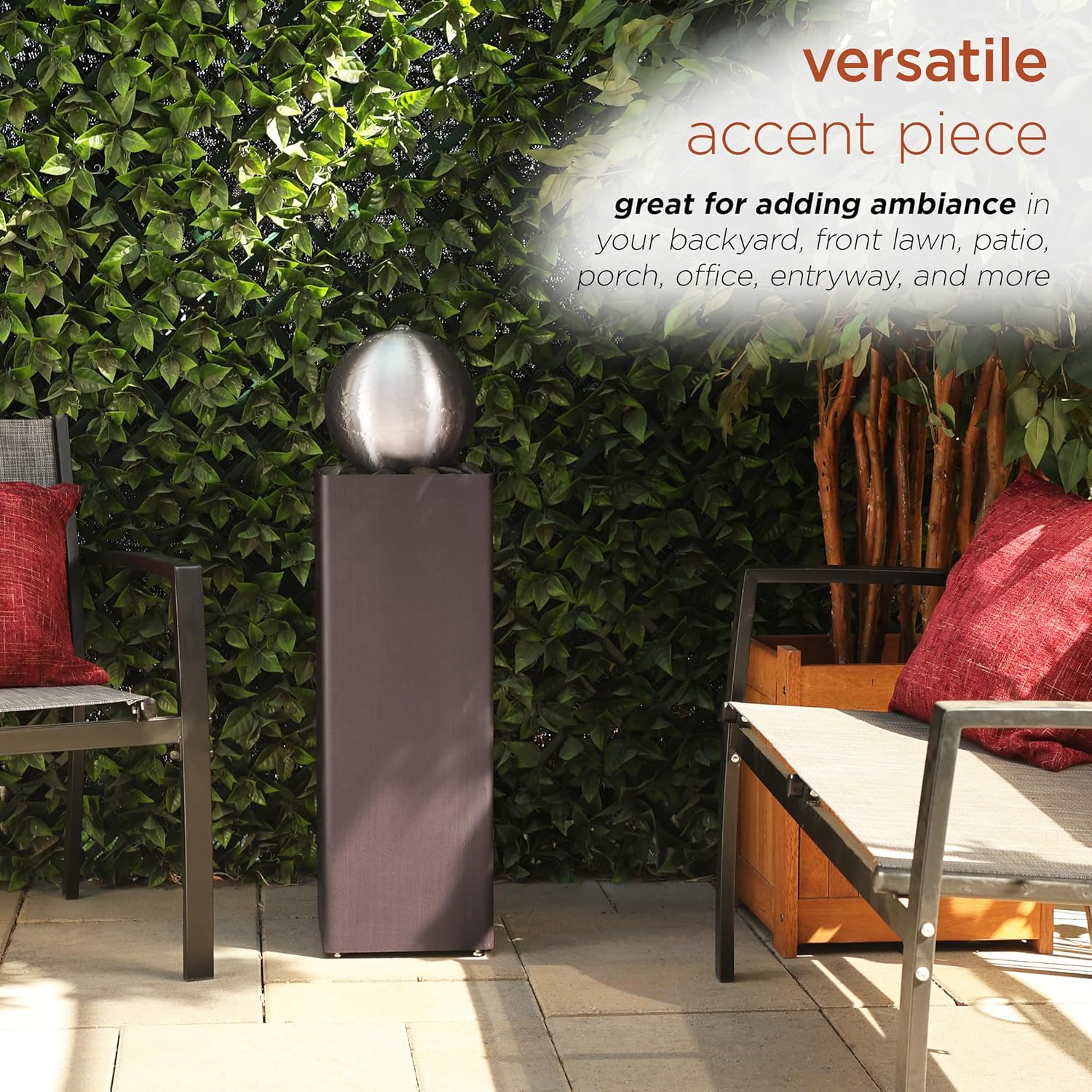 - Soothing Water Flow: This 37" fountain creates a peaceful and calming ambiance with a gentle flow of water cascading down the orb and river rocks, making it an ideal water feature for relaxation, meditation, or outdoor enjoyment.
