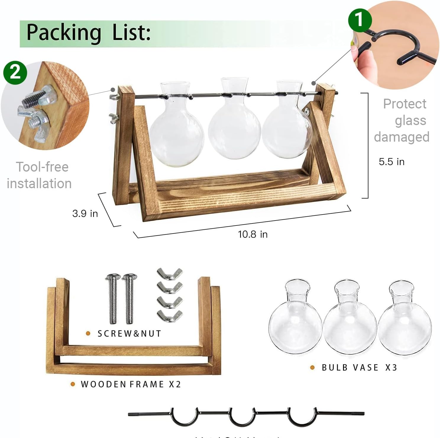 - Natural Wood Stand and Transparent Glass Vase: This propagating vases includes 3 bulb-shaped vases made of high borosilicate heat-resistant glass. The frame is crafted from sturdy and durable natural wood.The longer the time, the more delicate the wood looks