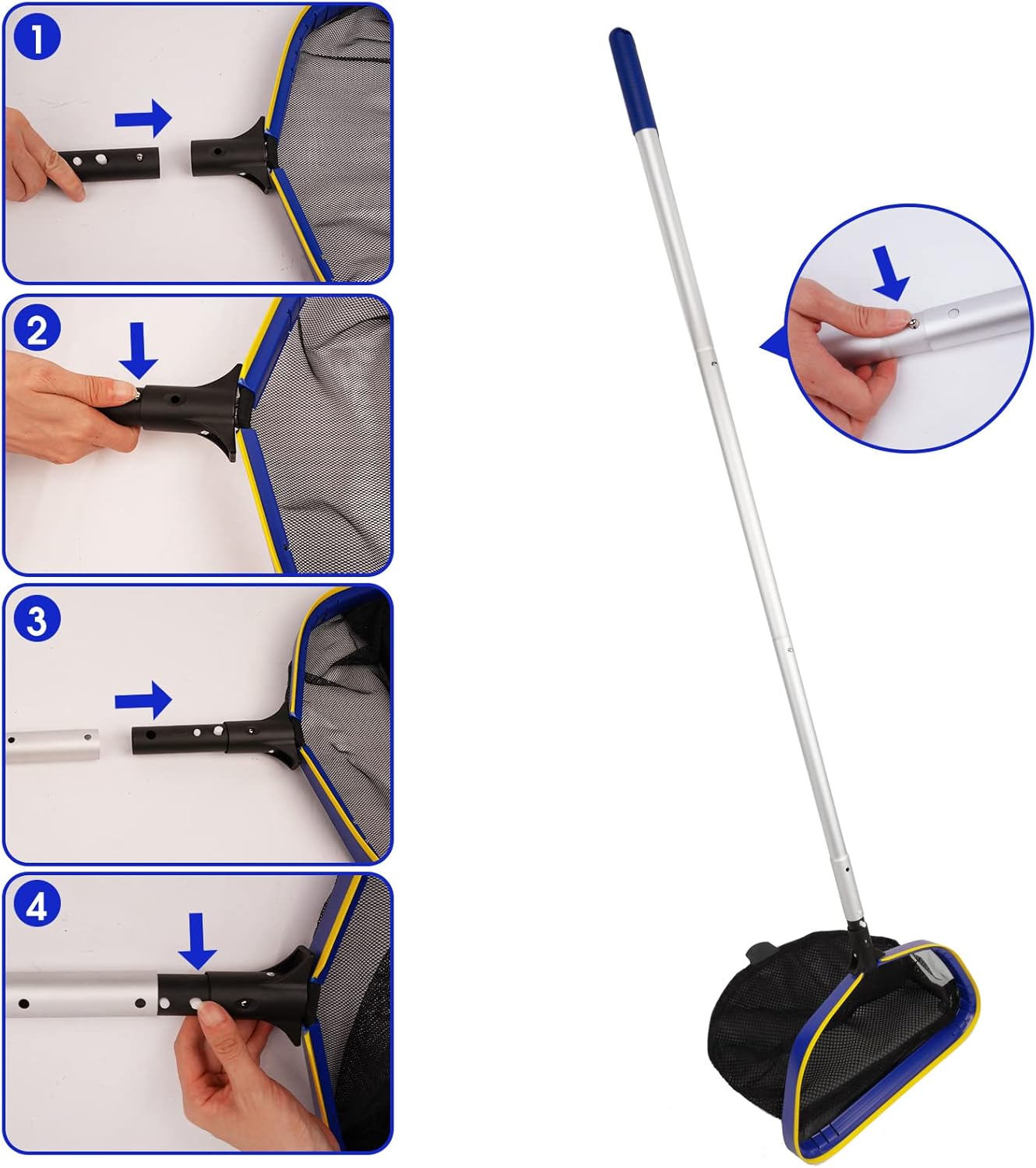 - QUICK AND EASY TO USE: Leaf skimmer net handle EZ clip buttons that prevent your fingers from getting pinched or jammed while attaching or detaching a pool pole. Extends and detracts in seconds helping you with even hard to reach places. Closes fully for easy storage