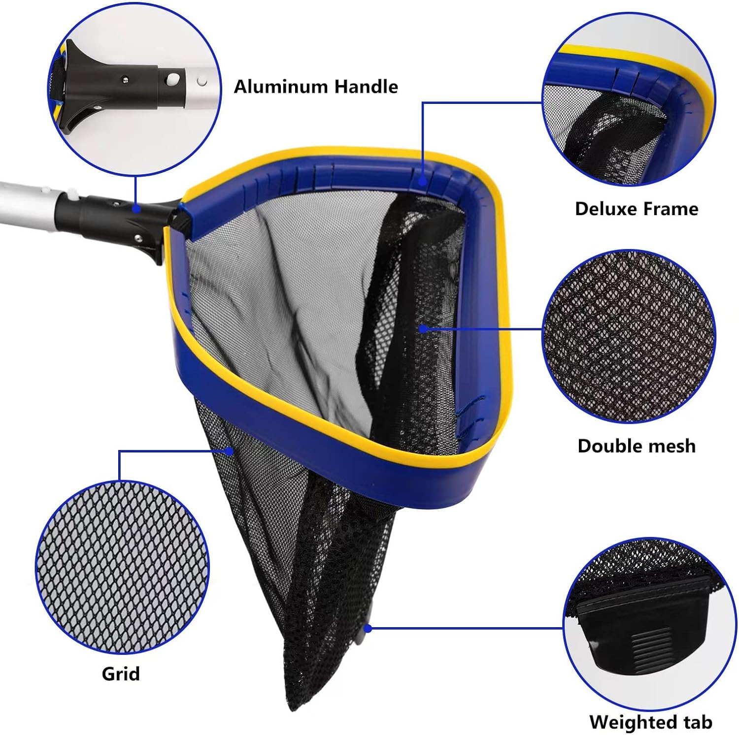 - Large-capacity and deep pool cleaning net: (17 x 16 x 17 inches) with a weighted tab at the bottom of the net to keep the net on the bottom when sweeping and makes easier to keep the leaves in the net. Emptying the leafs and debris from the net is made easier by holding the tab.Thickened aluminum bar frame can cope with a variety of pool cleaning scenarios and can be used for multiple seasons