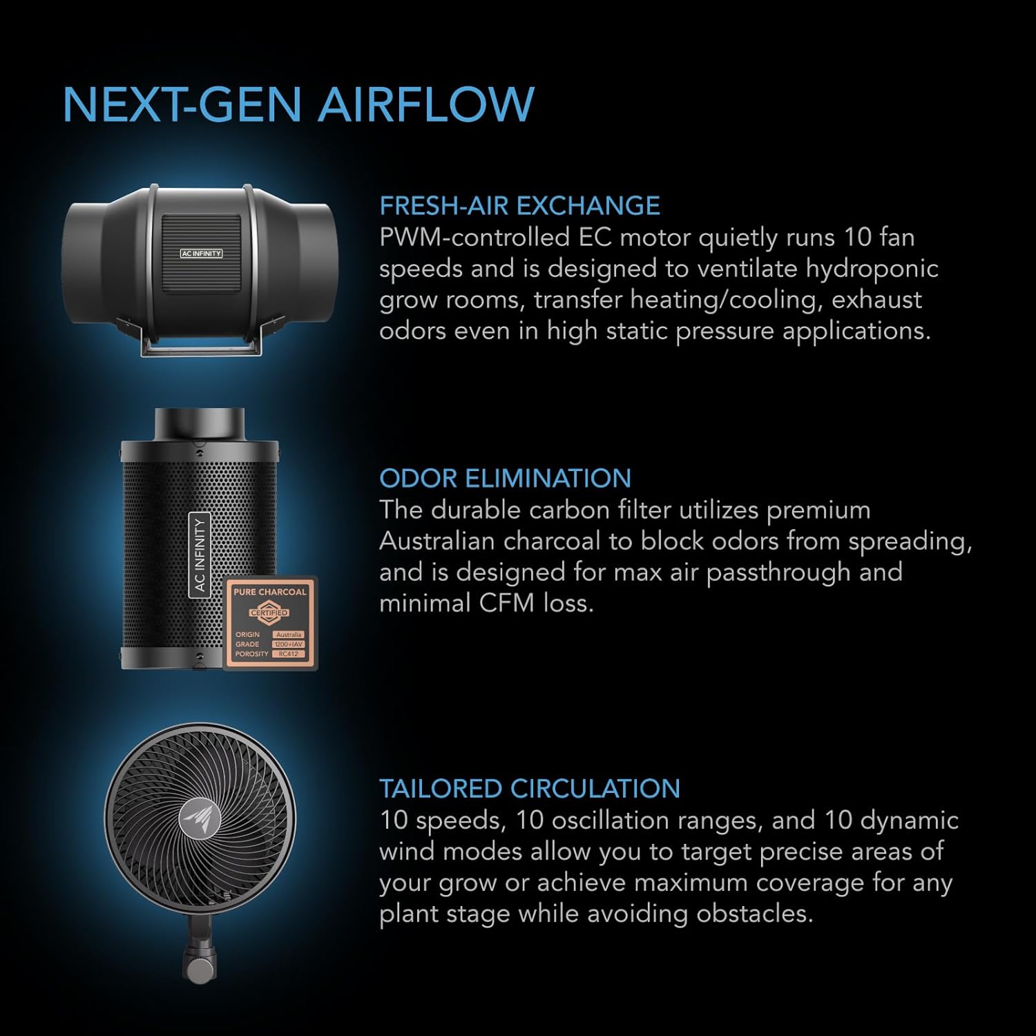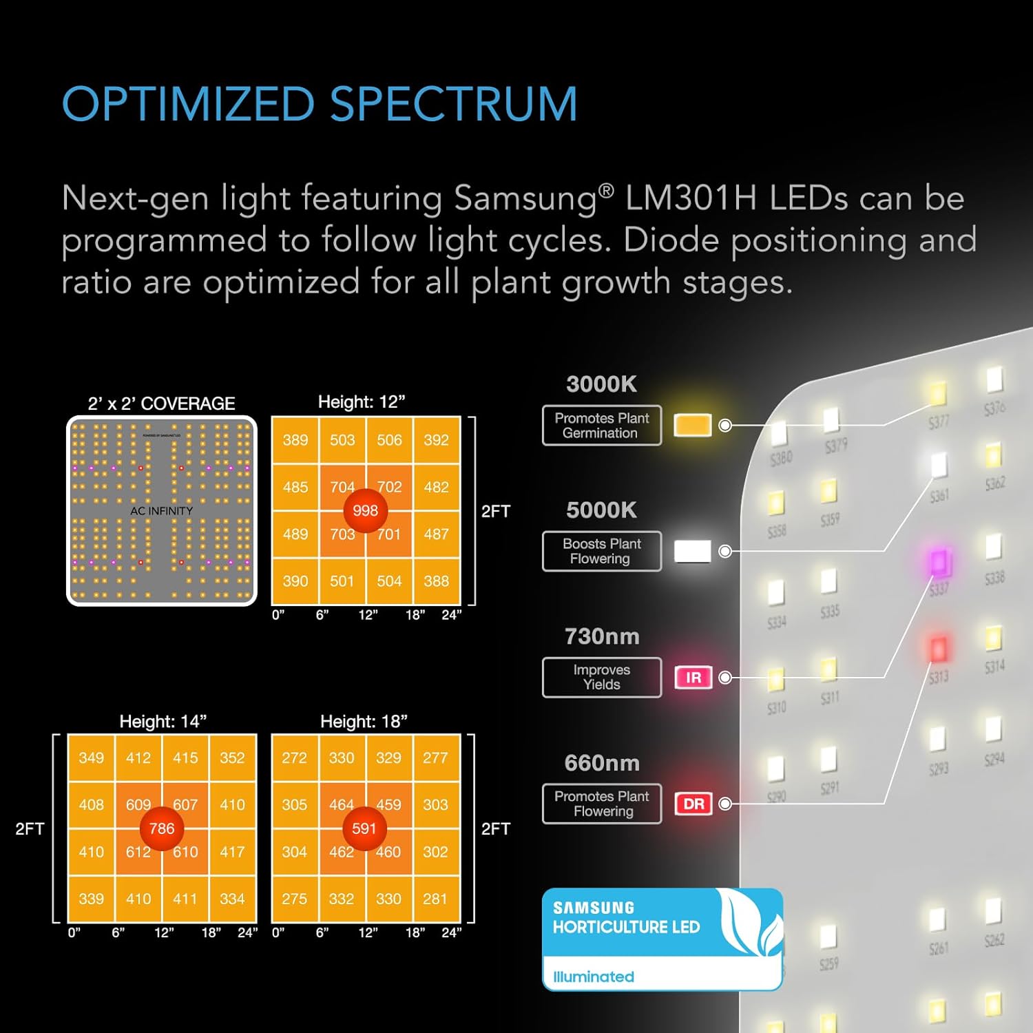 - EC inline fan 4”, oscillating clip fan 6”, and 2x2 full-spectrum grow light with Samsung LM301H LEDs.