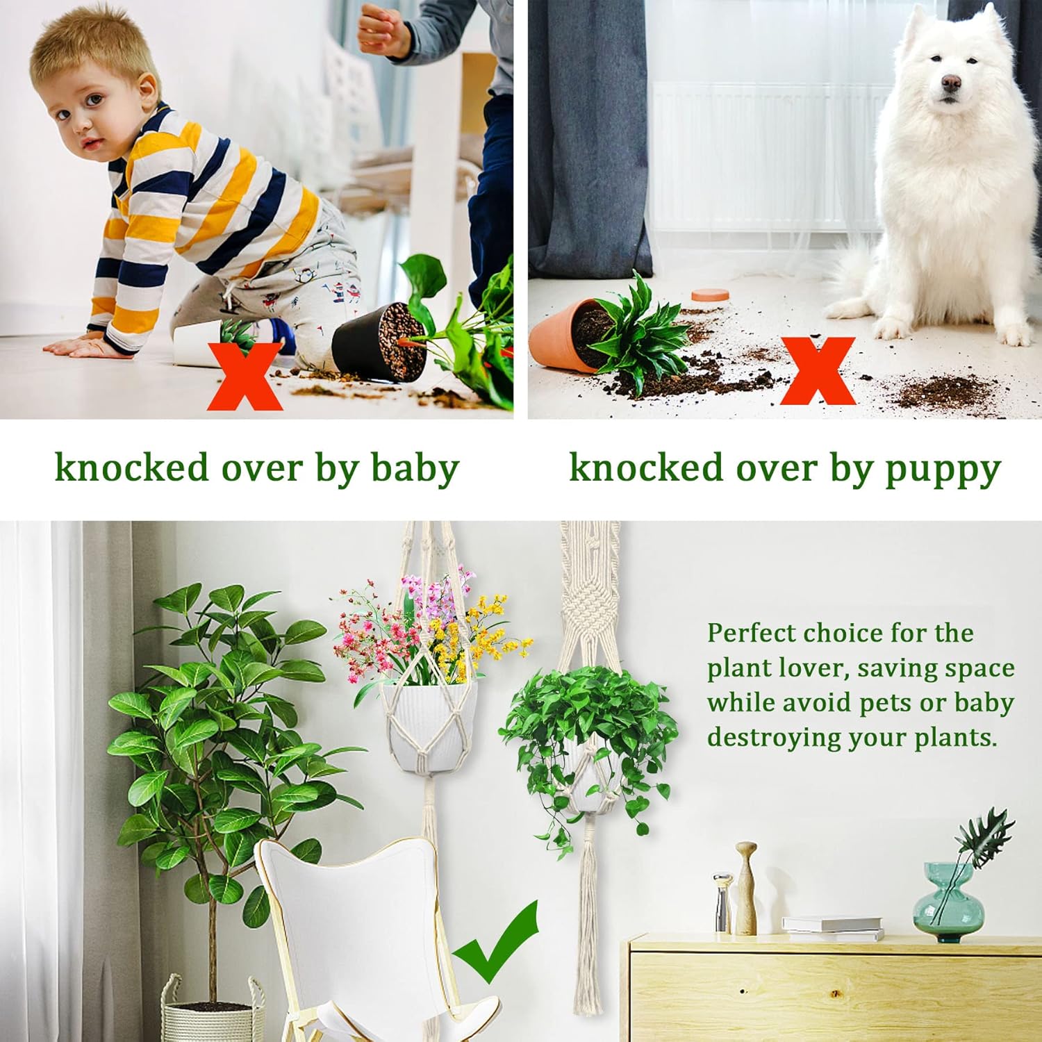 - 【Easy Installation Macrame Plant Hanger】Our macrame plant hanger come with 7pcs S hooks and 7pcs ceiling hooks, easy to screw in ceiling or hanging on curtain rack.The plant hanger is suitable for indoor and outdoor use. These hanging macrame planters are easy to use, just expand the 4 legs, put the flowerpot into the bottom middle.This plant hanger will fit a variety of flower pot shapes and sizes.Our plant hangers indoor macrame can keep your plants safe from curious toddlers and pets.