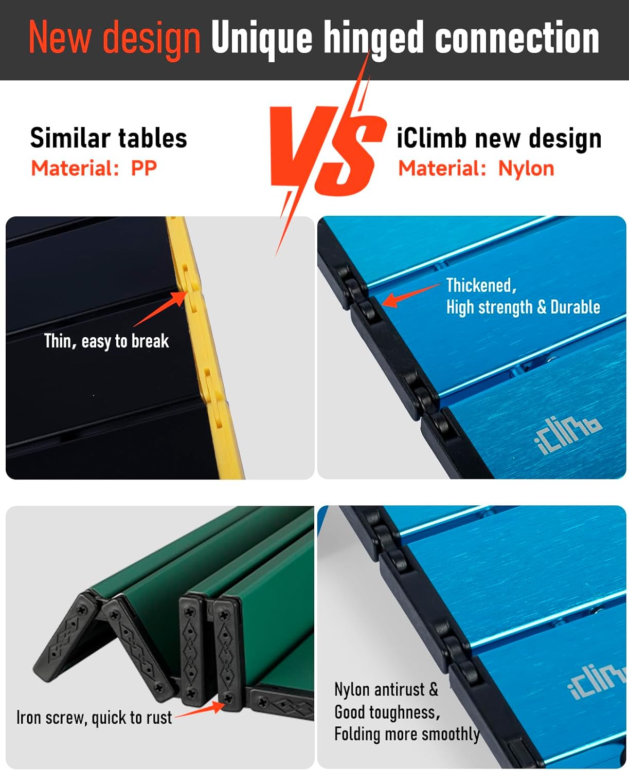 - Unlike other similar tables with bungee cord connection, this table has unique hinged design connection which will make it last many years.