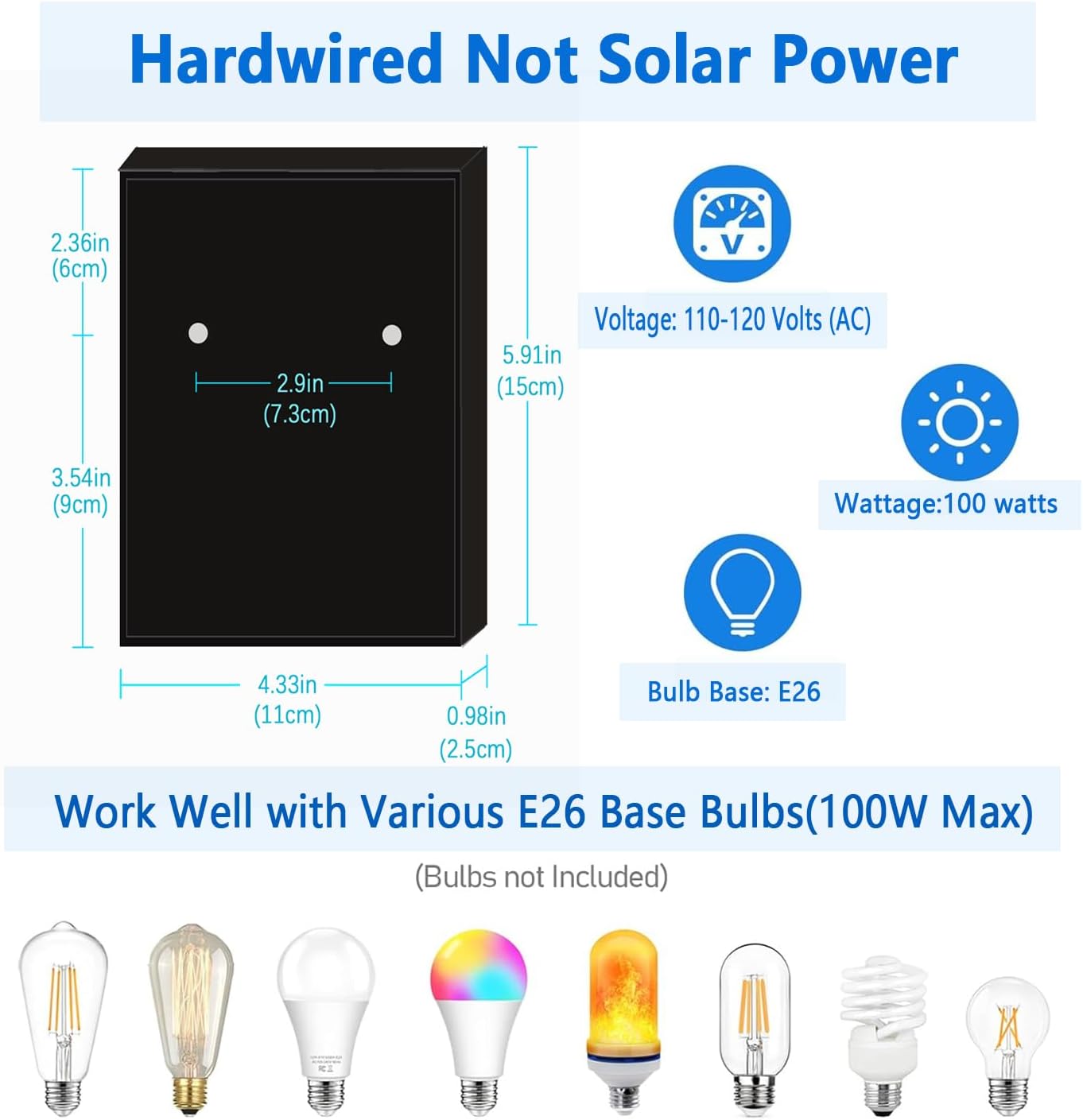 - 【3 Lighting Modes】The black porch lights offer you three different modes(High/Low/Manual). ①High Mode: Stays all night 28% brightness and turn 100% brightness when motion is detected.After two minutes of no motion detection, the brightness is restored by 28%. ②Low Mode: 0% brightness without movement at night, 100% brightness with movement detected,auto-off after 60 seconds without movement.③Manual Mode: In① or② mode, toggle the wall switch "off-on" within 0.5 to 2 seconds to shift from auto mode to manual mode, the light will tum on and stay on for 8H±1H, or until the dusk to dawn sensor detects light in the morning.Reminder: No matter what mode, the lamps will be turned off during the day