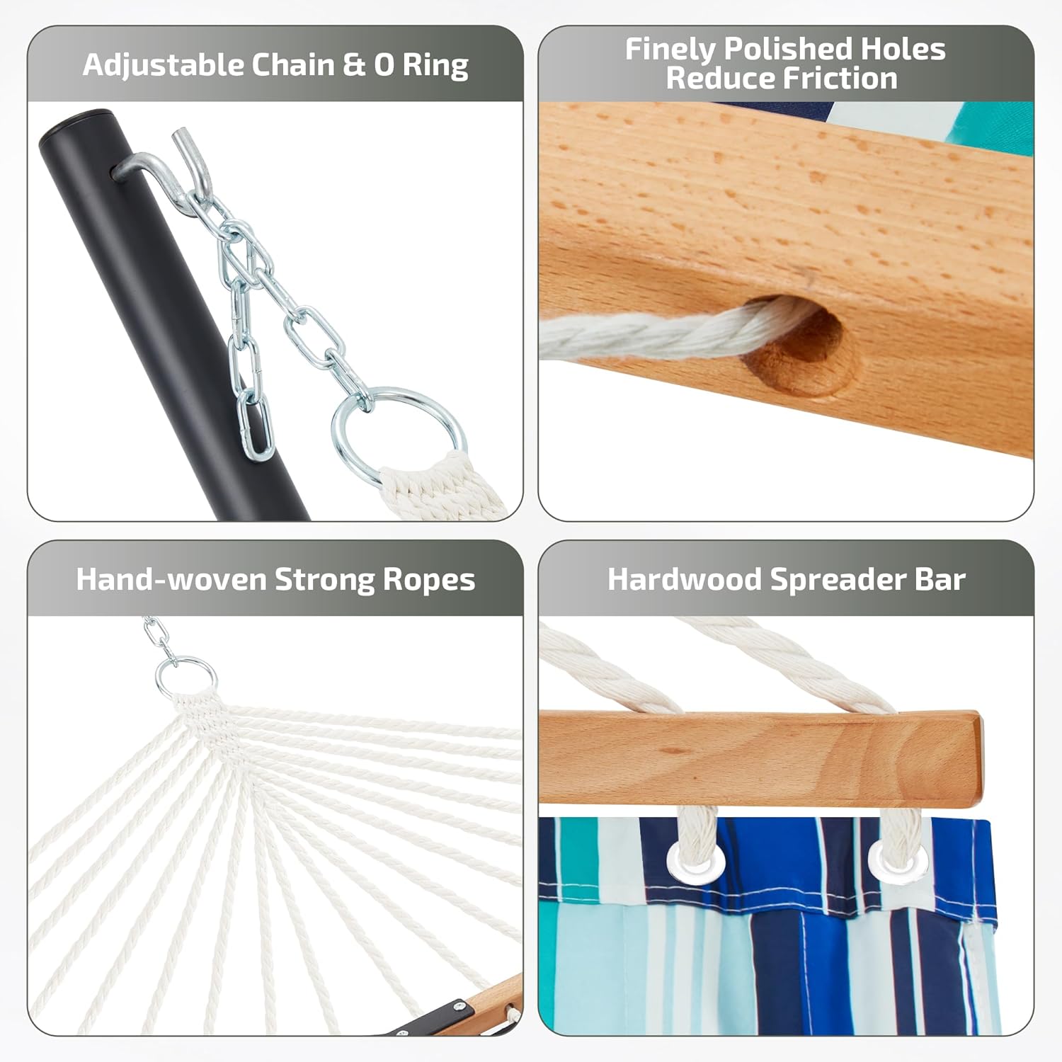 - 【Curved Spreader Bar】The angle of the curved bars make the center of gravity more stable when using. The countersunk spreader bar holes can reduce the friction between rope and wood which make the hammock stands the test of time.