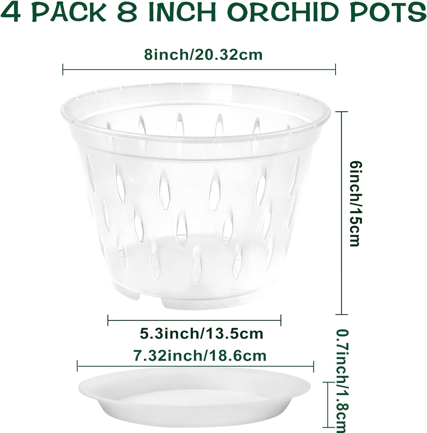 - 8 Inch Plastic Orchid Pots Size: 8 inches on the top; 5.3 inches diameter at the bottom; 6 inches in Height. The package includes 4 packs of orchid pots with saucers
