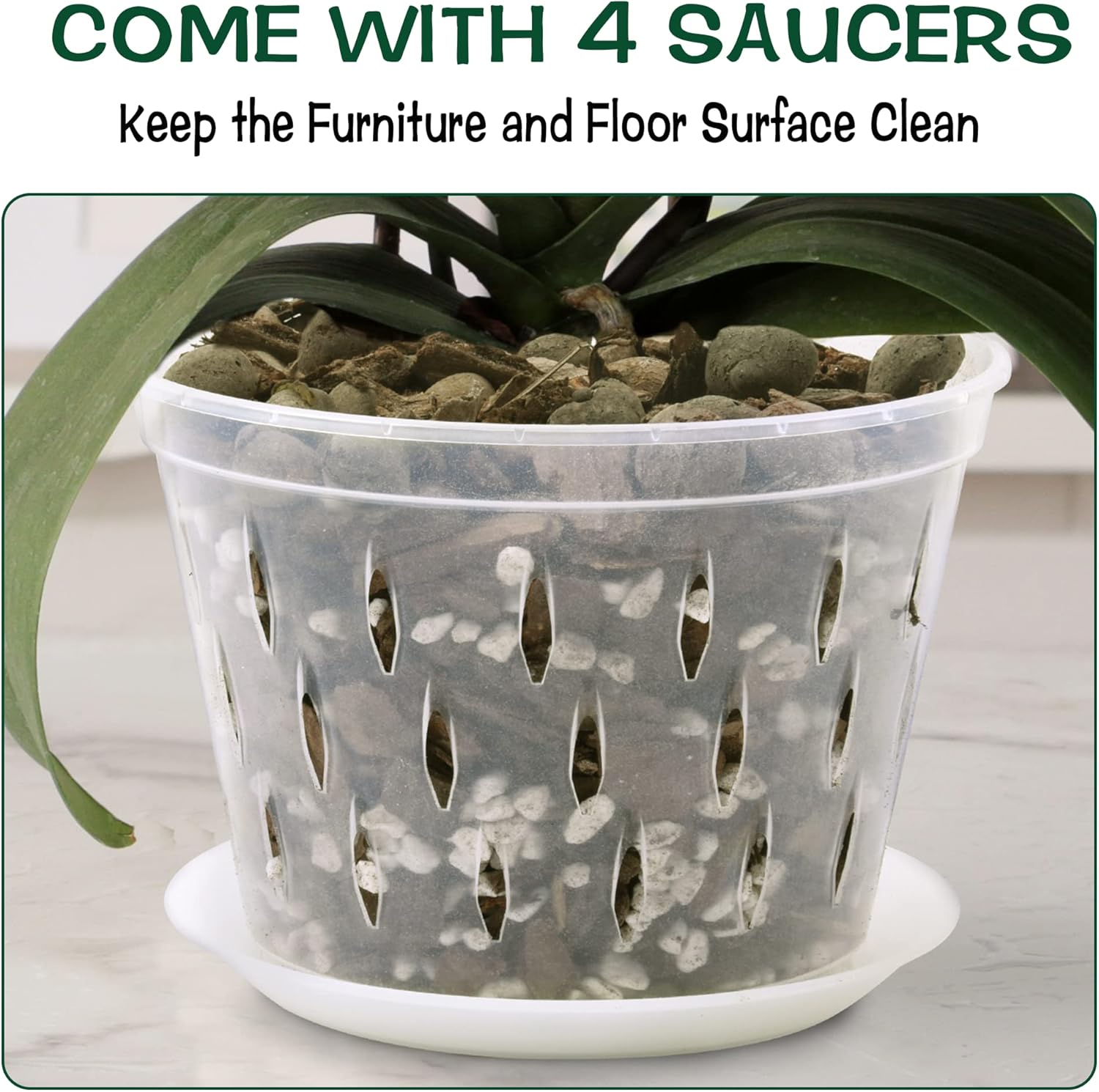 Orchid Pot, 8 Inch 4 Pack Orchid Pots with Holes and Saucers, Clear Plastic Orchid Pots