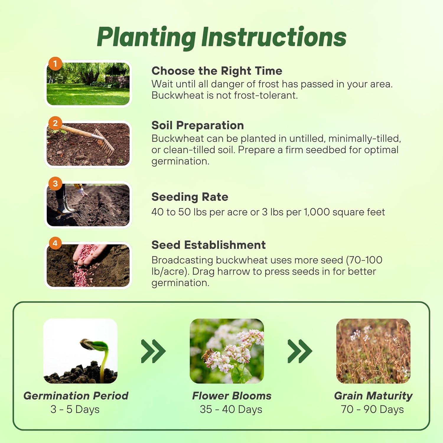 - EASY SEEDING & FAST-GROWING COVER CROP: Sow our Buckwheat seeds at 40 to 50 lbs per acre or 3 lbs per 1,000 sq. ft. after all danger of frost has passed in spring or summer. These seeds grow quickly, providing effective ground cover that prevents soil erosion and controls unwanted vegetation.