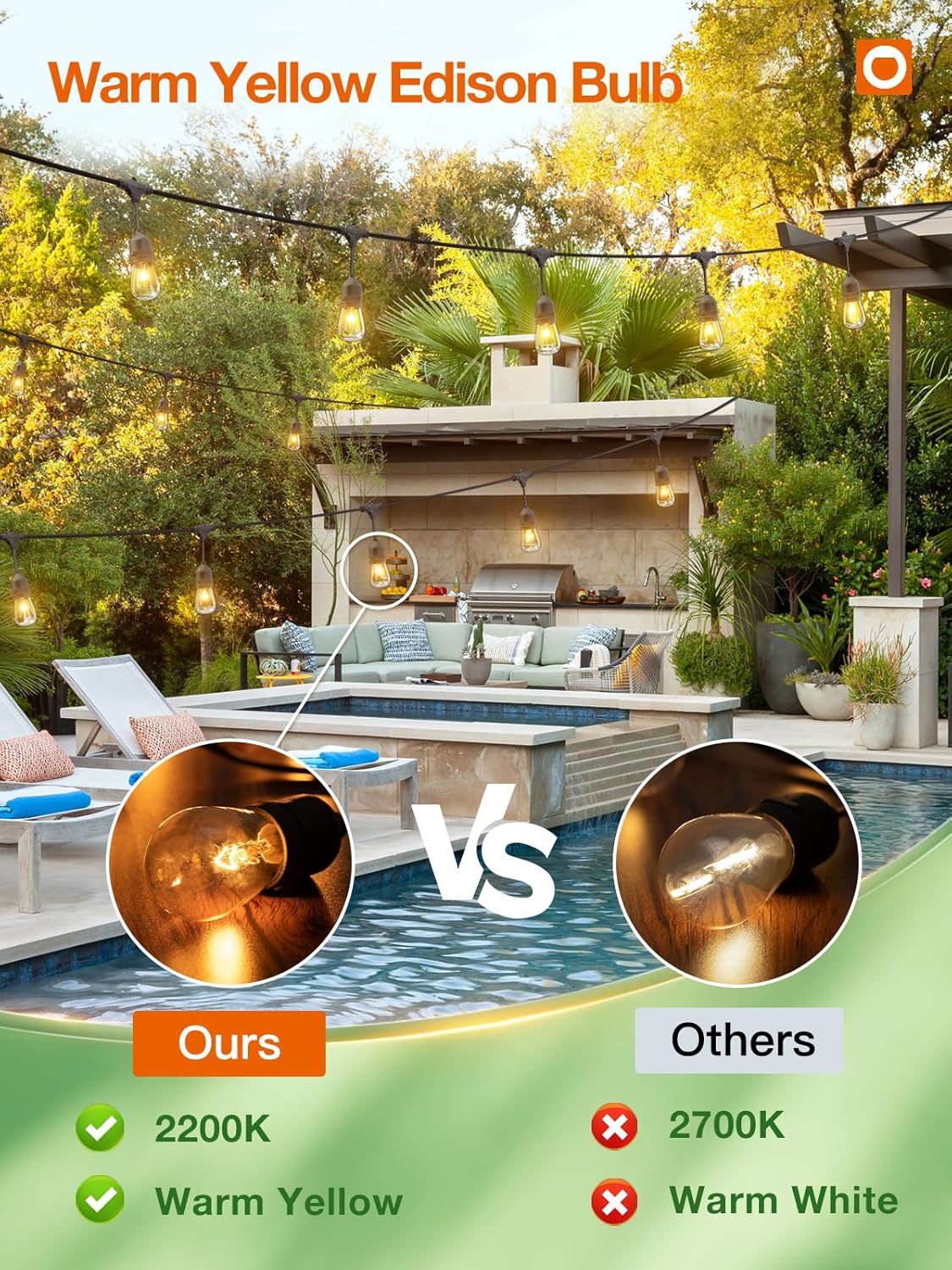 - Ideal Outdoor Lighting: It will come with 2 strands of 48FT string lights. Each strand contains 15 hanging sockets and 3 spare bulbs, provided with 18 5W S14 incandescent bulbs. The distance between bulbs is approximately 3.11FT. This heavy-duty light is bright enough and ideal illumination anywhere.