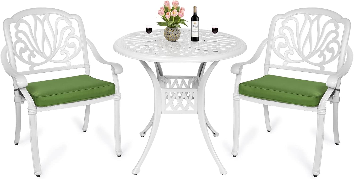 MEETWARM 3 Piece Patio Bistro Set, Outdoor All-Weather Cast Aluminum Dining Furniture Set Includes 2 Chairs and a 31” Round Table with Umbrella Hole for Garden Deck, White