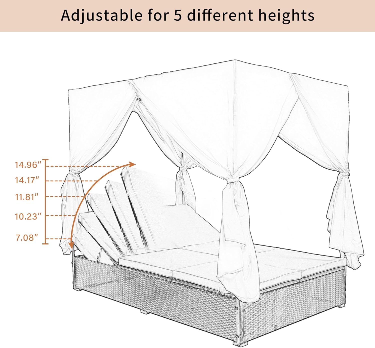 - 【Perfect Outdoor Furniture】This stylish rattan rectangle sunbed has side and overhead curtains to provide both shade and privacy. It is suitable for 2-6 people to lie or sit. Create a new vision for your balcony, garden, backyard or poolside.