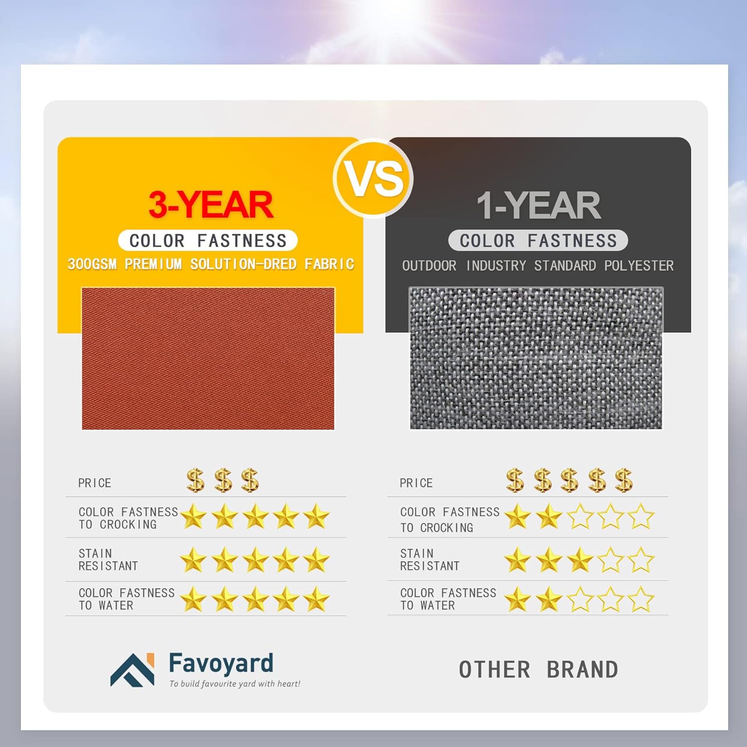 - 3-year Color Fastness - Our patio chair cushions adopt 300GSM High Density polyester fabric, thanks to the superb coloring technology, we proudly say the fading resistant is 20 times that of ordinary products, Favoyard outdoor seat cushion for patio furniture is a perfect decor in garden, patio, beach and etc.