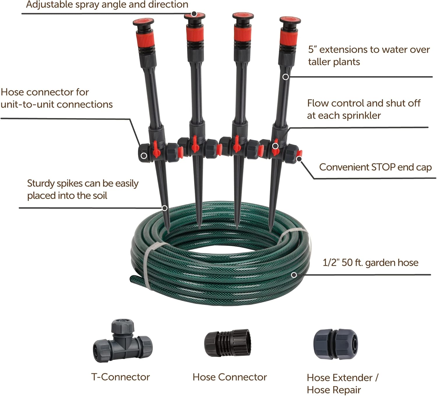 - INCLUDES COMPLETE SET FOR EASY SETUP – Comes with (4) adjustable sprinklers, (4) 5" riser extensions, (1) 50 ft hose (½" diameter), (1) 3-way hose connector, (2) hose connectors, and (1) hose mender