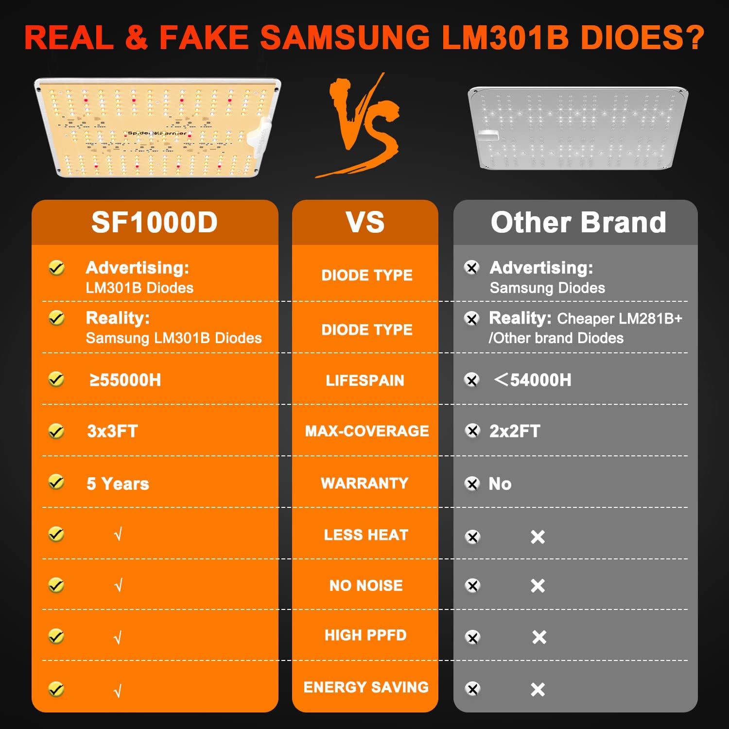 - SAMSUNG LM301B Diodes: 2025 New Version SF1000D LED grow light uses premium Samsung LM301B diodes and LED plant light technology, delivers powerful light output and uniform canopy penetration, lights can be absorbed better by plants. Veg footprint is 3 x 3 ft, Flowering footprint is 2 x 2 ft.