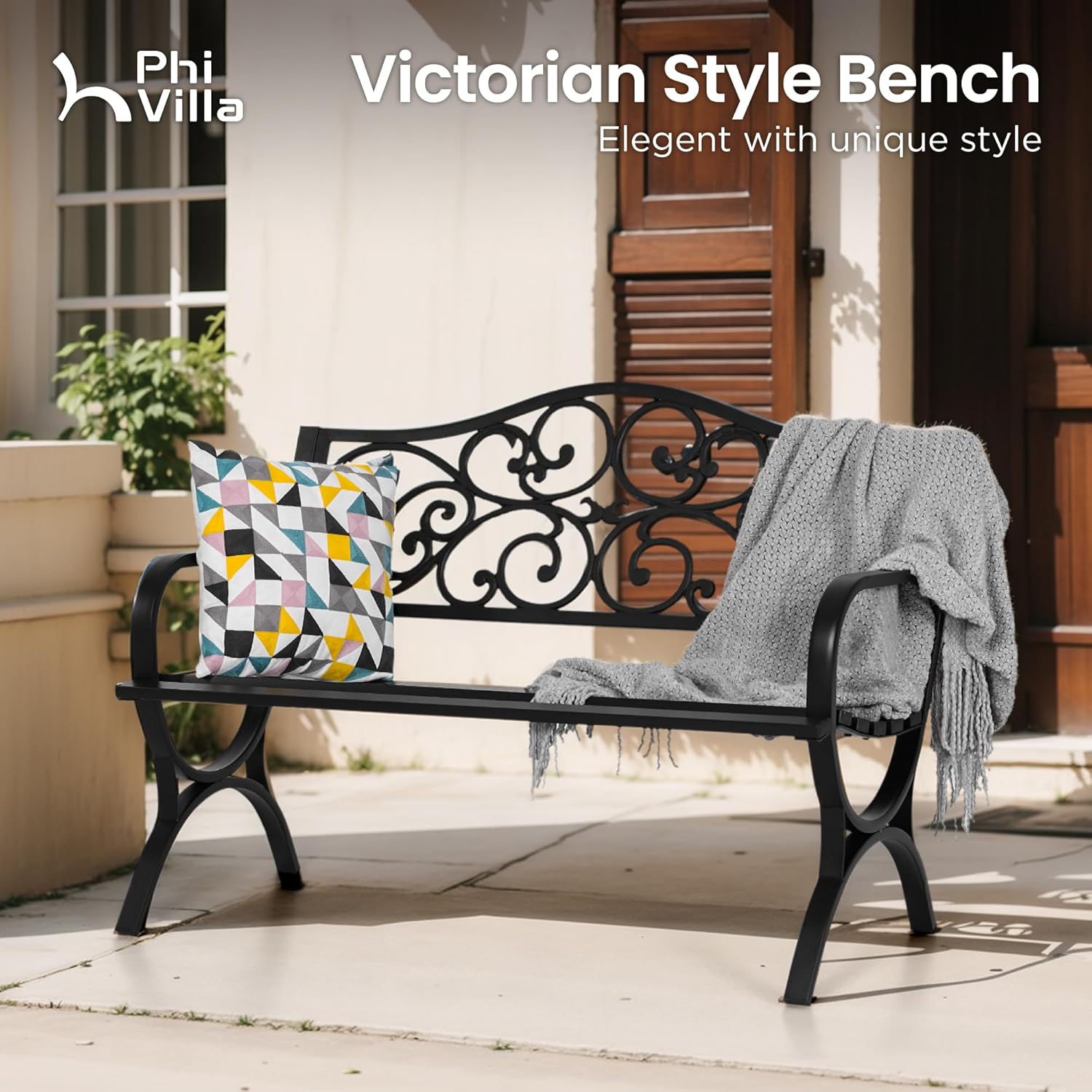 PHI VILLA 50-Inch Cast Iron Steel Frame Garden Bench Outdoor Patio Bench Chair w/Floral Design Backrest, Slatted Seat for Park, Yard & Porch, Black