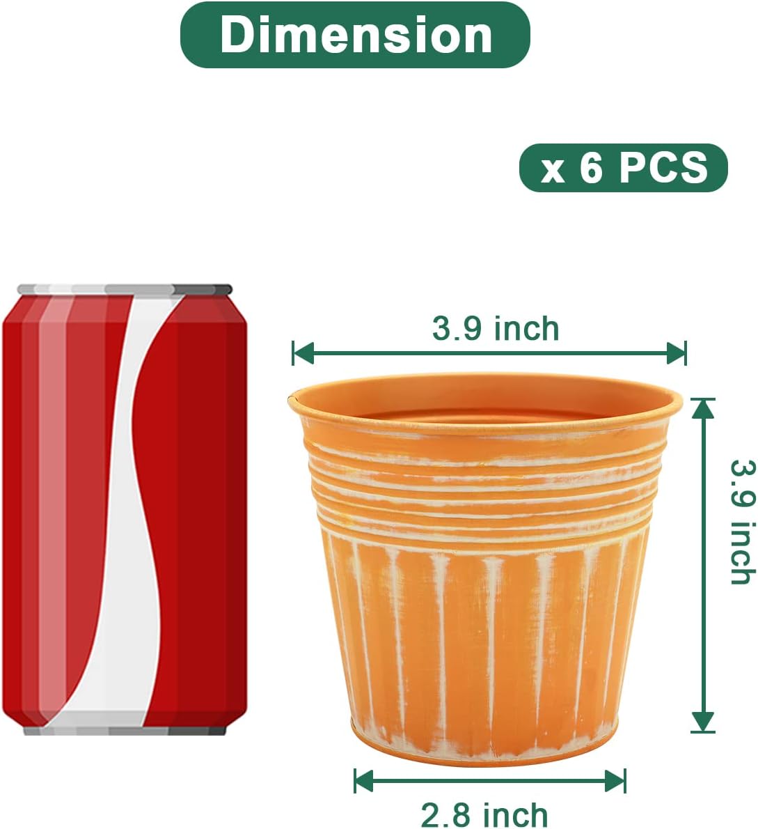 - 【Size of Metal Flower Pots】There are 6pcs metal planters in a package. The topper opening diameter 3.9 inches, the bottom diameter 2.8 inches, and the barrel height is 3.9 inches. These tin buckets have ample space for plant growth, making them ideal for succulents, herbs, and flowers, keeping your greenery vibrant.
