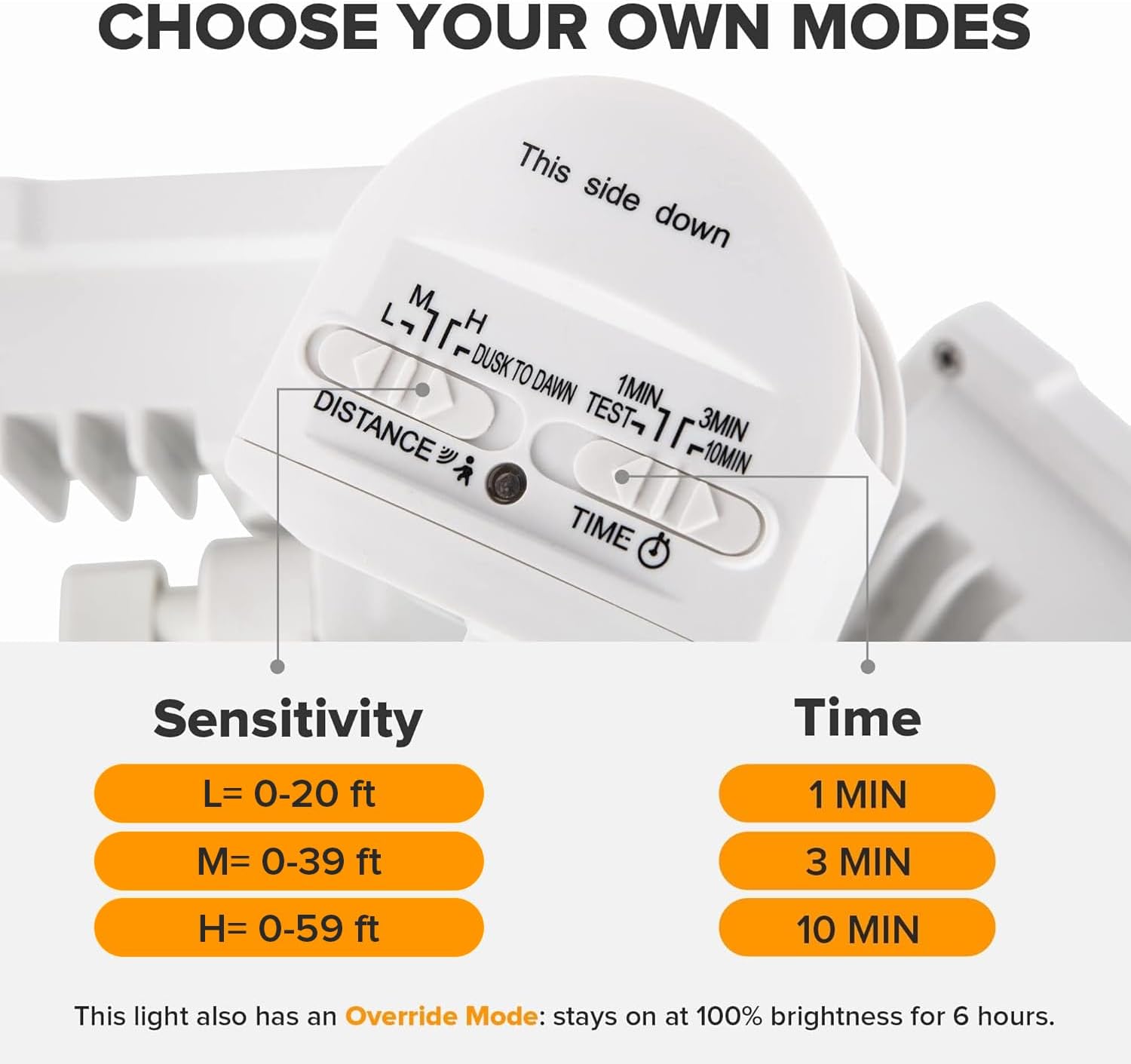 - 【4 LIGHTING MODES】Test Mode, Security Mode, Dusk to Dawn Mode and Manual Override Mode. Manual override mode allows light to operate constantly for selected period of time. More choices can meet different demand for each customer. Choose the most appropriate mode for your needs and desires.