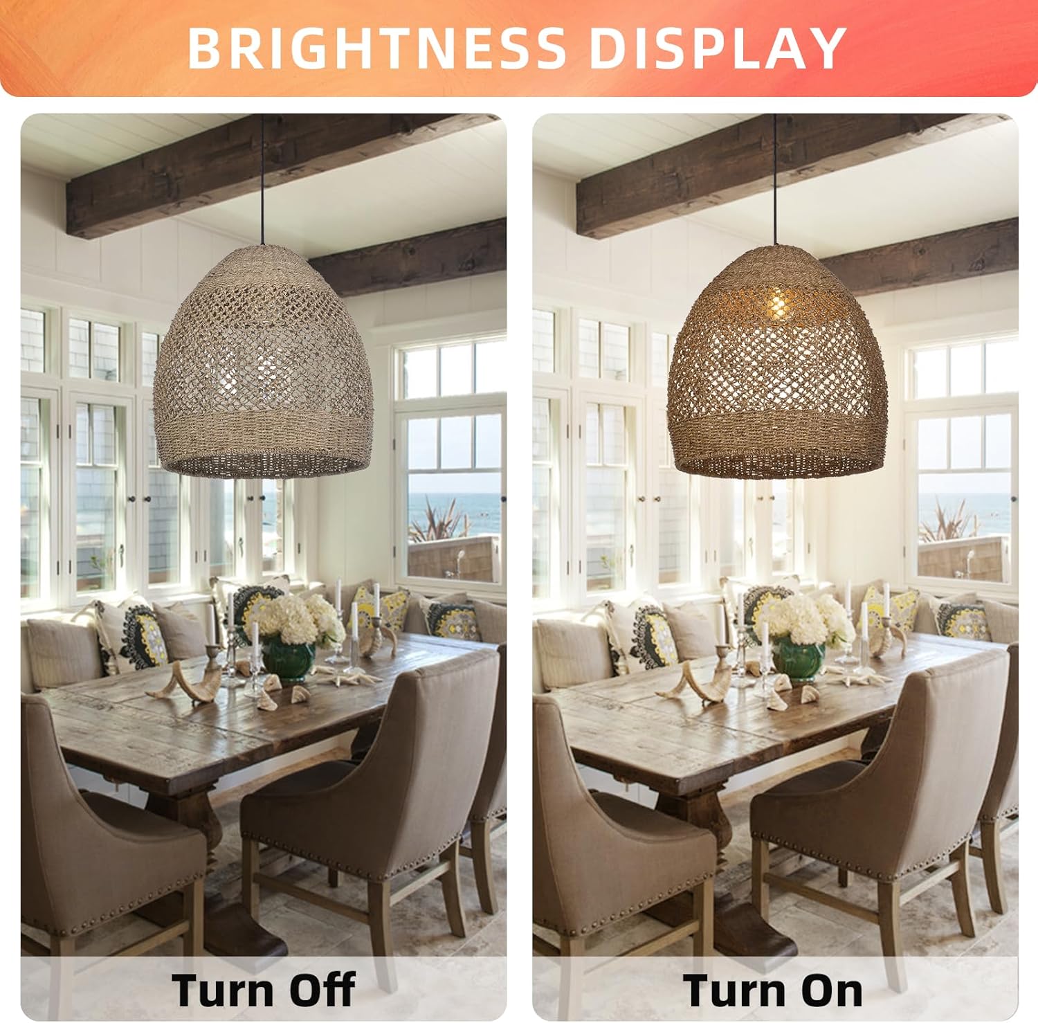Arturesthome 19.6" Retro Rattan Woven Pendant Light Fixture, Chandelier with Lamp Shade Light Cover, Hanging Lighting for Kitchen Dining Room Foyer