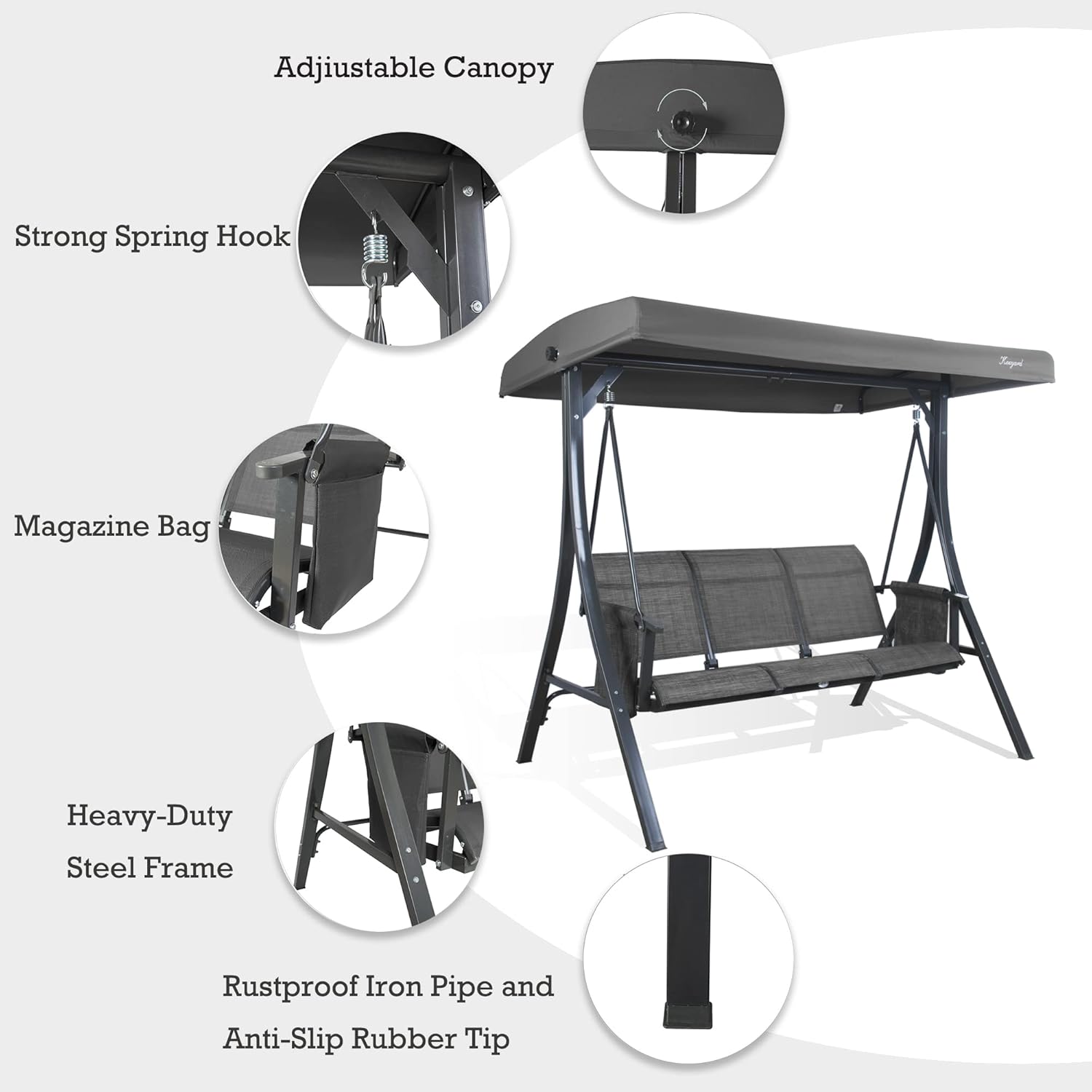 • ✅3 Person Seating Capacity - This porch swing with canopy has a comfortable, long bench seat design with room for three. Suitable as an outdoor swing chair, garden swing, backyard swing, lawn swing, patio swing chair, deck swing, or a yard swing.