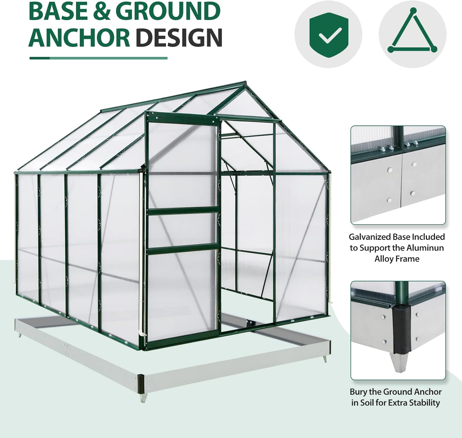 - STABLE BASE & GROUND ANCHOR: The EAGLE PEAK walk-in greenhouse comes with a heavy-duty galvanized base to support the house frame. The unique ground anchor design helps bury it deeply in soil to add extra stability.