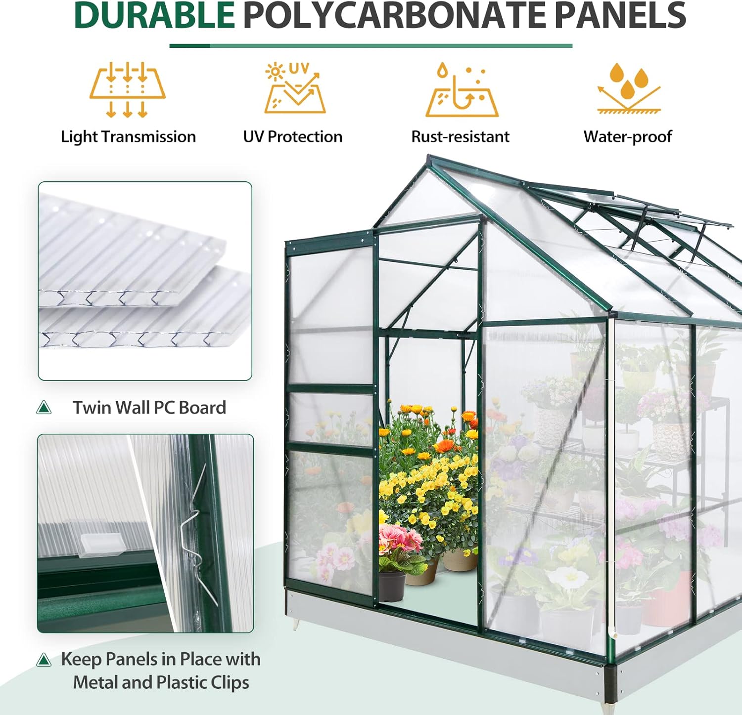 - PREMIUM MATERIAL: The outdoor hobby green house is made of a high quality aluminum frame and 4 mm twin-wall poly carbonate roof panels. The transparent panels help block UV rays but also allow maximum light transmission.