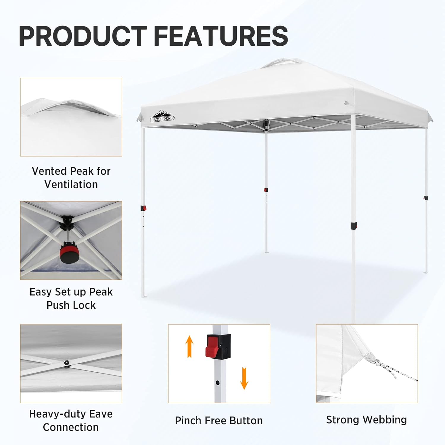 EAGLE PEAK Pop Up Canopy Tent with Wheeled Carry Bag, 8 Stakes, 4 Ropes, Easy Set Up Tent Canopy, 8x8 ft White
