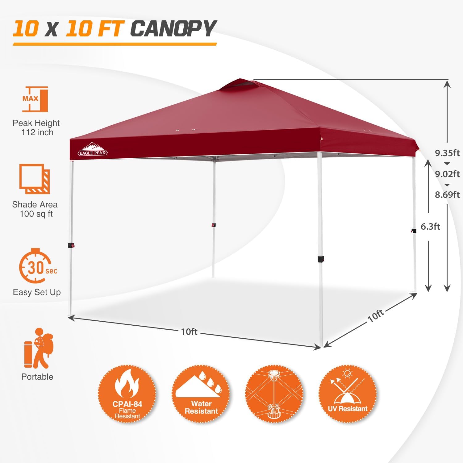 EAGLE PEAK Pop Up Canopy Tent with Wheeled Carry Bag, 8 Stakes, 4 Ropes, 4 Weight Bags, Easy Set Up Tent Canopy, 10x10 ft, 100sqft of Shade, Burgundy