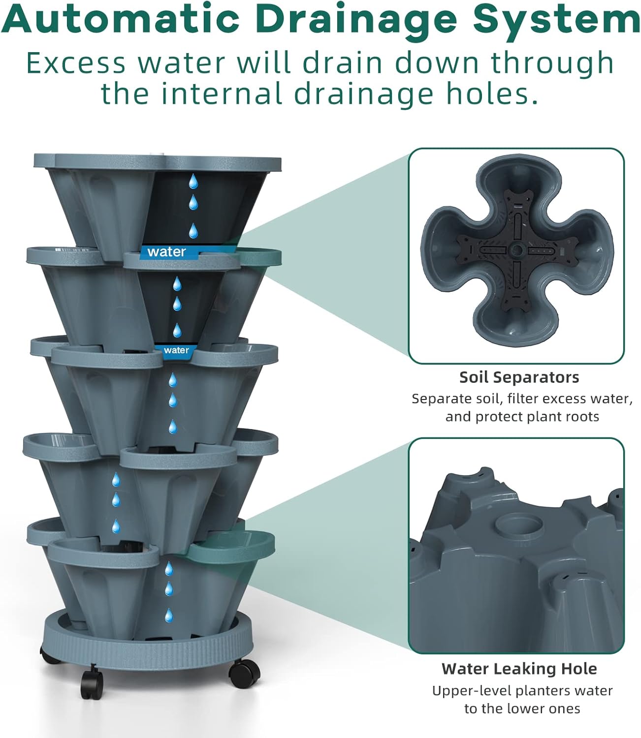 - 5 Tier Vertical Planter - 5 tier stacking planter, made of BPA-free material, can hold up to 20 different plants, such as strawberries, spinach, leaf lettuce, arugula, and mustard greens, and a few smaller herbs and flowers. Plus, it's the perfect vessel for strawberries as the berries cascade over the container lip.