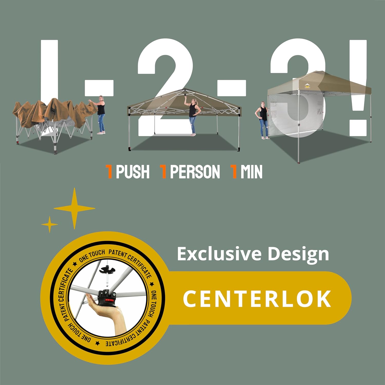 - ONE BUTTON EASY SET UP - Our 10x10 pop up canopy tent features patented one push center lock tech. With just a single push, the central hub locks the poles in place. Designed for the next generation, this outdoor canopy for patio can be set up by two people in seconds without any tools. Three adjustable height settings with soft, pinch-free buttons ensure convenience and safety, making it perfect for camping, beach outings, craft fairs, tailgating, farmer markets, outdoor BBQs, and more