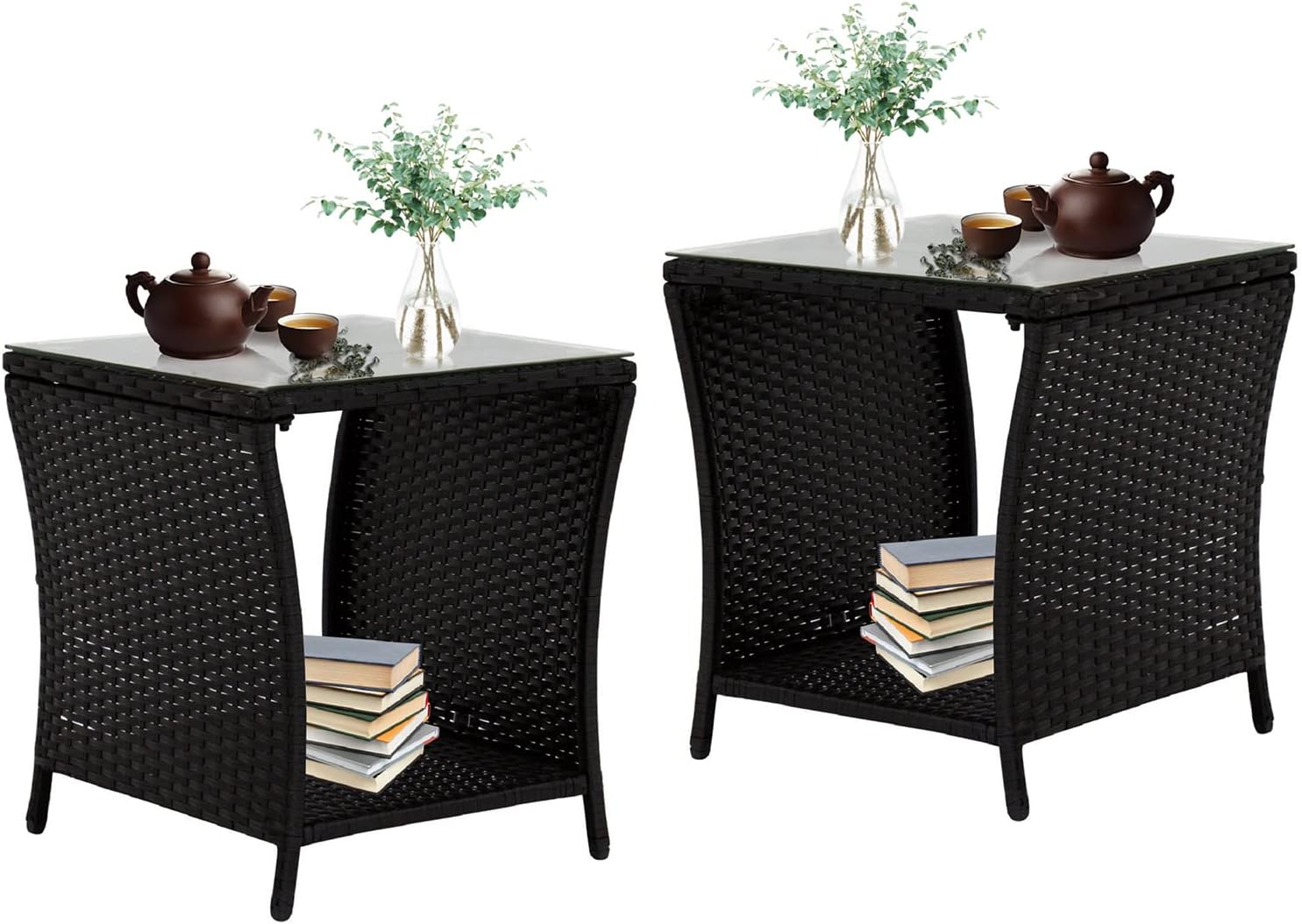 Outdoor Small Patio Table - PE Rattan Coffee Table, Wicker Side Table for Patio, Balcony & Porch, Durable & Iron Frame (2, Dark Black)
