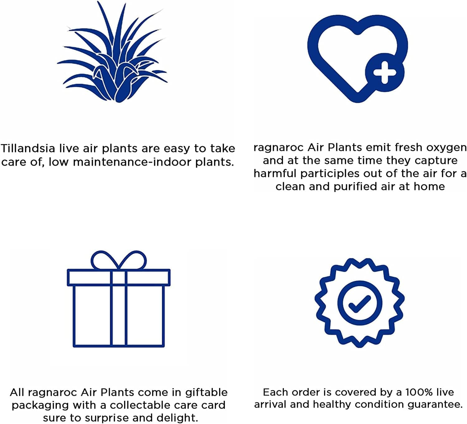 - HEALTHY PLANT ARRIVAL ASSURANCE: ragnaroc is committed to delivering vibrant and thriving air plants to your doorstep. Our live air plants are packed directly from Florida, and every order comes with a promise of their safe and healthy arrival. If, for any reason, you find yourself less than satisfied with our plants, please inform us, and we will promptly arrange a full refund or send you replacement plants.