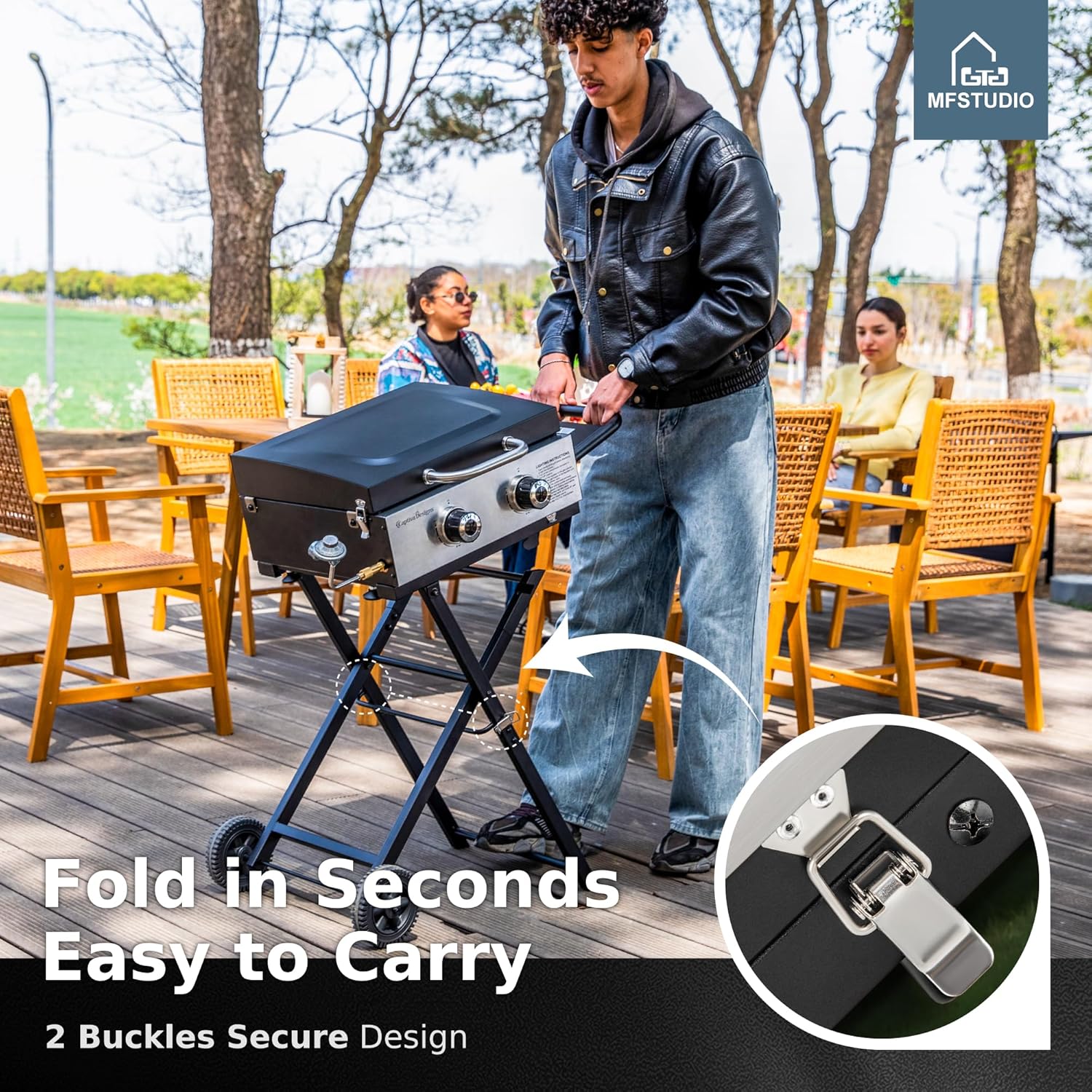 - More Thoughtful Accessories: Buckles design that allows the stand to be locked in place. The main body of the griddle can be locked or detached from the stand for separate use. It comes with two types of adapters, allowing direct connection to either a 1-pound portable propane tank or a 20-pound canister of gas.