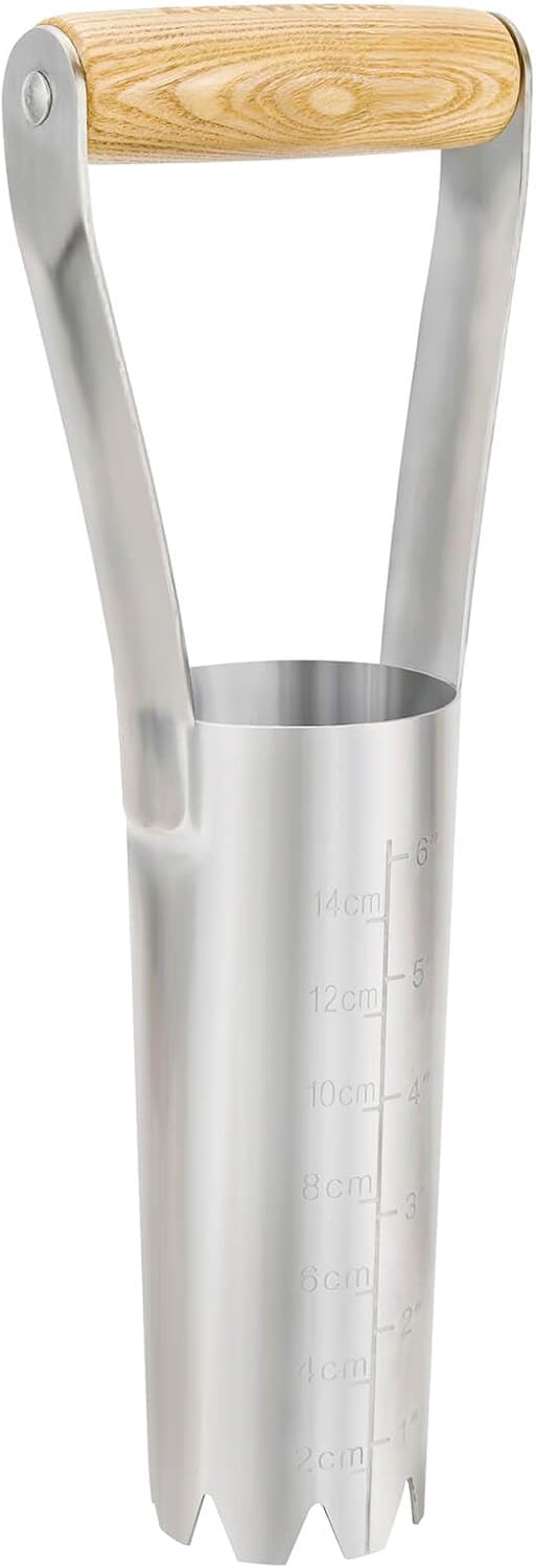 - MAKES PLANTING PROCESS SPEEDY AND EFFICIENT - Simply press the bulb planter into the soil to the required depth, twist to remove a core of soil, pop the bulb into the hole, and replace the core.Unlike most bulb planters, our unique design features a deeply serrated edge to easily penetrate packed ground, cleanly removing a cm diameter core. The planter is clearly marked with depth indicators up to 6 inches for precise planting.