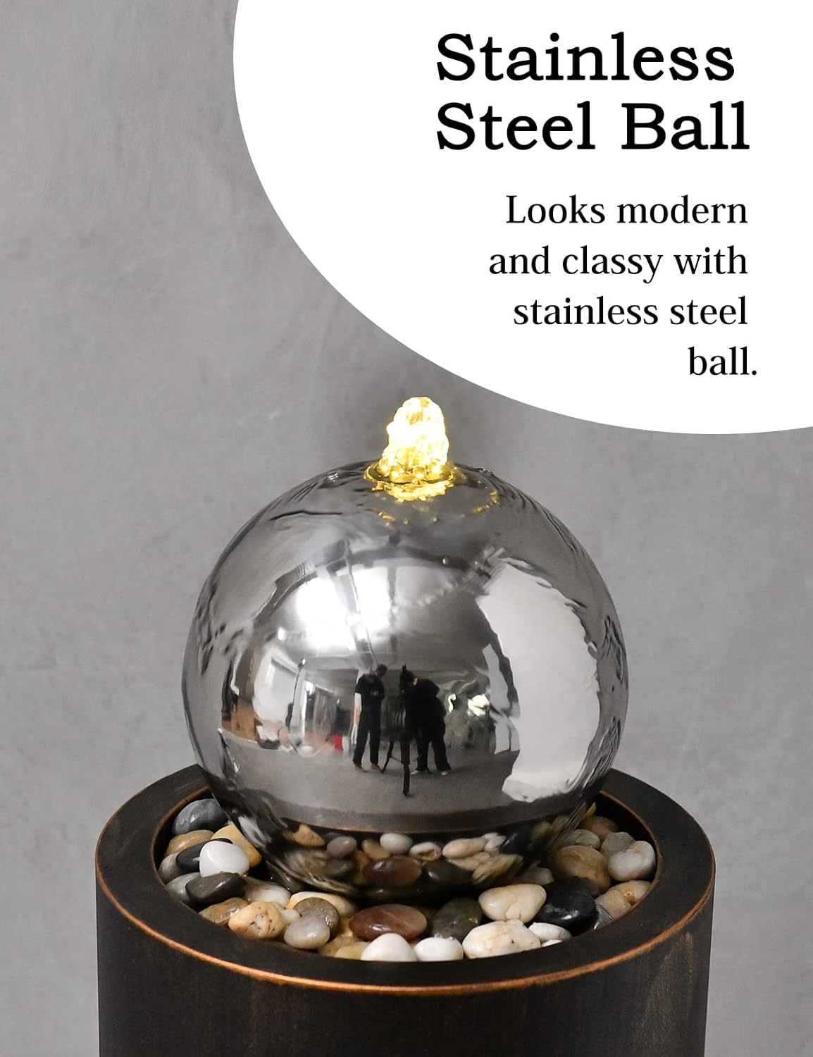 - DESIGNED FOR AMBIENCE: Water feature-water flows from the top of the orb down onto the bed of rocks,soft sound brings peaceful ambiance to outside inside space.