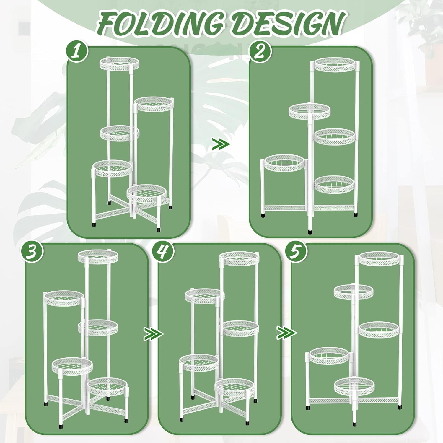 iDavosic.ly Plant Stand Indoor Outdoor, 5 Tier Corner Metal Flower Display Holder Shelf, Folding Tall Orchid Rack for Patio Balcony Porch Garden Living Room House, Wrought Iron - White