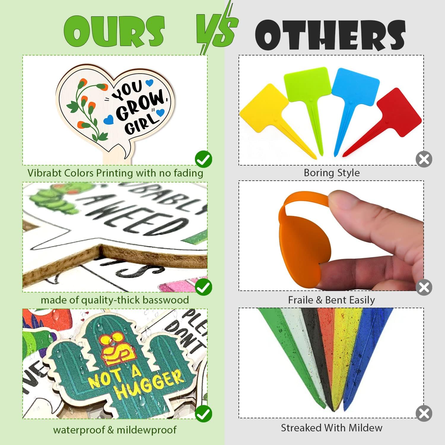 - 🌿Sturdy & Durable: The plant labels for outdoor garden waterproof are made of high-quality wood, which is sturdy and durable, with high-quality printing, not easy to fade, and can stand the test of time. The T-shaped garden marker design, the garden labels bottom is pointed, you can easily insert it into the flower pot. Compared with plastic plant stakes, it is more environmentally friendly, does not contain harmful substances, will not pollute the soil and harm plants.