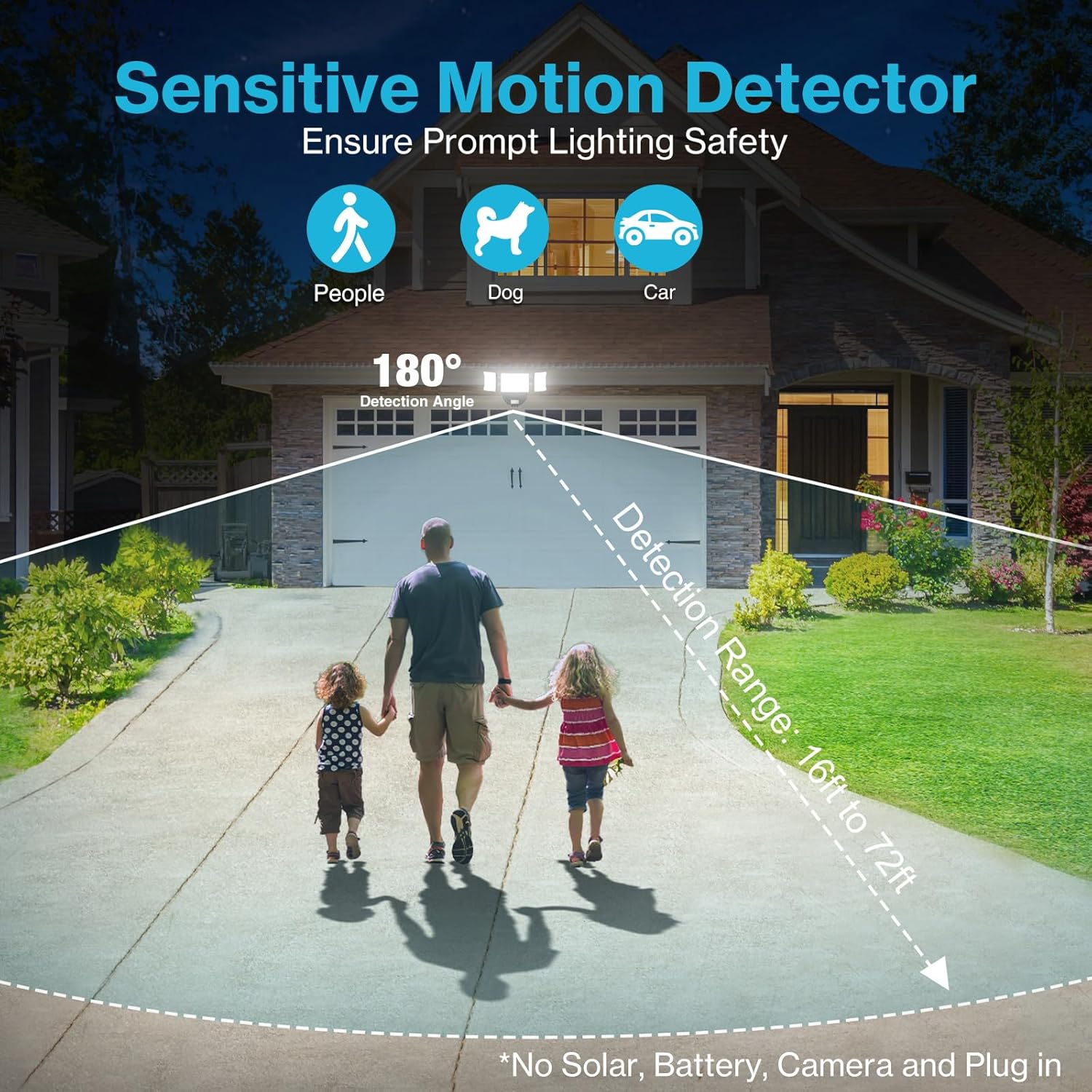 - Ultra Bright and Energy Saving: This 6000 lm motion sensor light illuminates yards, garages, driveways, corridors, and porches, enhancing security at night. Only lighting up when motion is detected, saving energy and extending lifespan