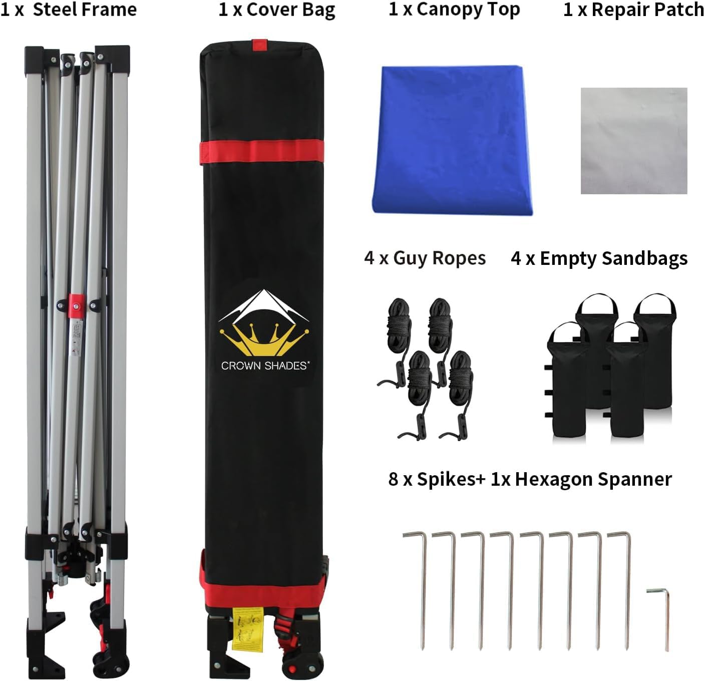 - STO’ N GO SYSTEM - Our lift-free system makes collapsing, storing, and transporting the 10x10 tent a breeze. The 10x10 popup canopy can be stored with the fabric attached, with a specialized pocket for 4 sandbags, 8 stakes, and 4 guy ropes. Integrated wheels in the feet allow easy movement even when the instant shelter tent is set up, by simply lifting the side without wheels. This feature is especially useful for quick setup and takedown at locations like the patio or sports events