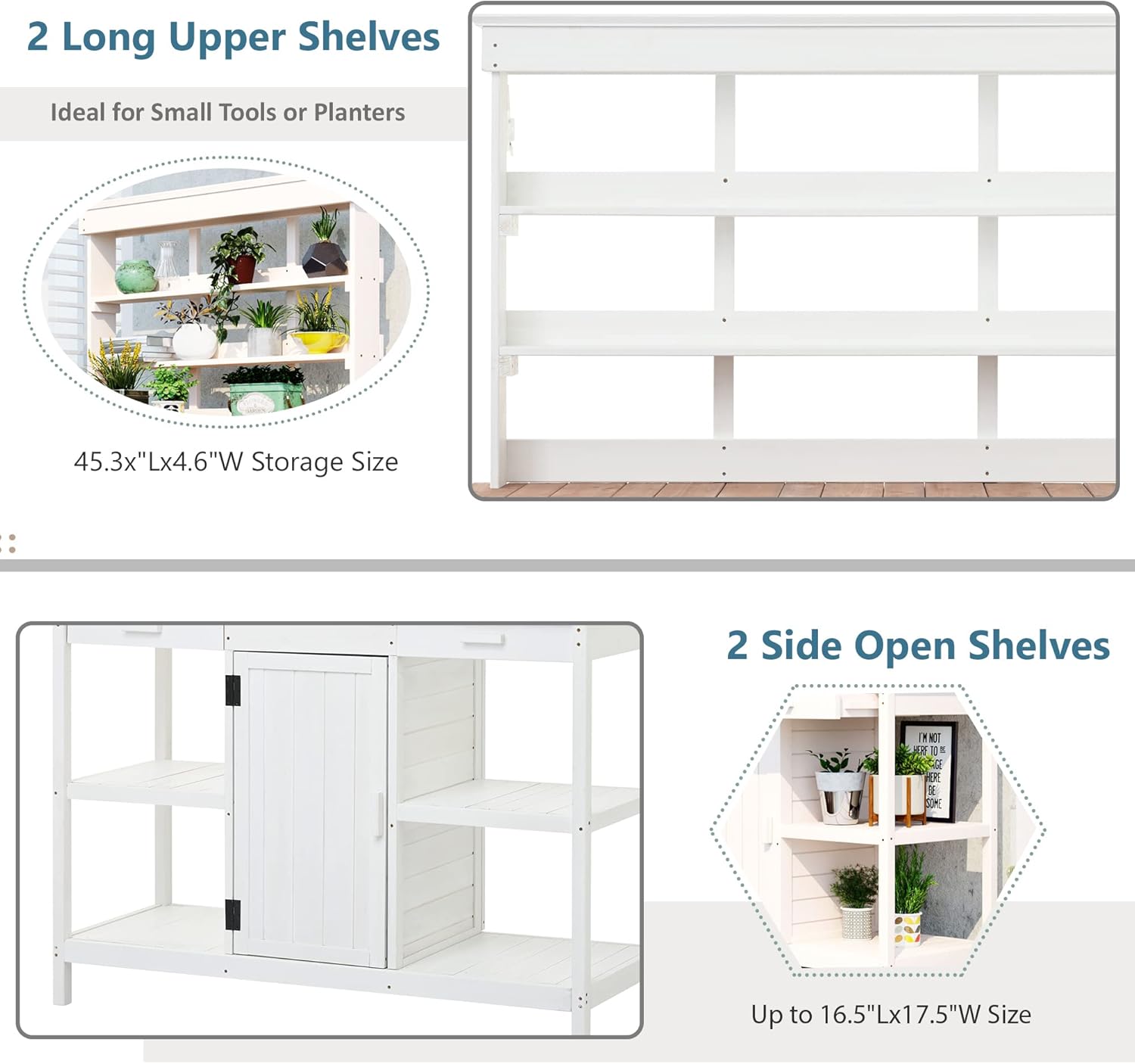 Merax 66" Large Outdoor Farmhouse Wooden Potting Bench Table, Garden Workstation with 2 Drawers, Cabinet, and Open Shelves for Backyard, Mudroom, White