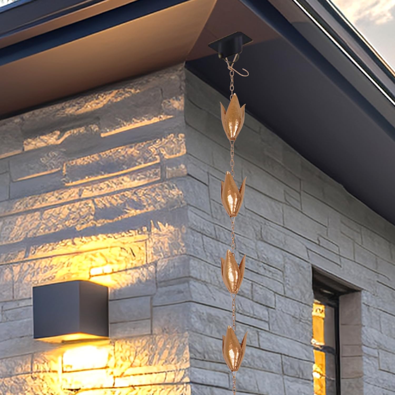 - 102" Long for Universal Fit. Include 12 cups. This rain chain combines decoration and function replacement of ugly rectangle downspout gutter.